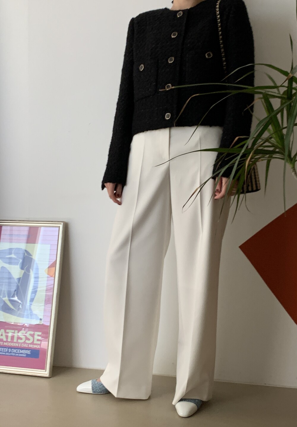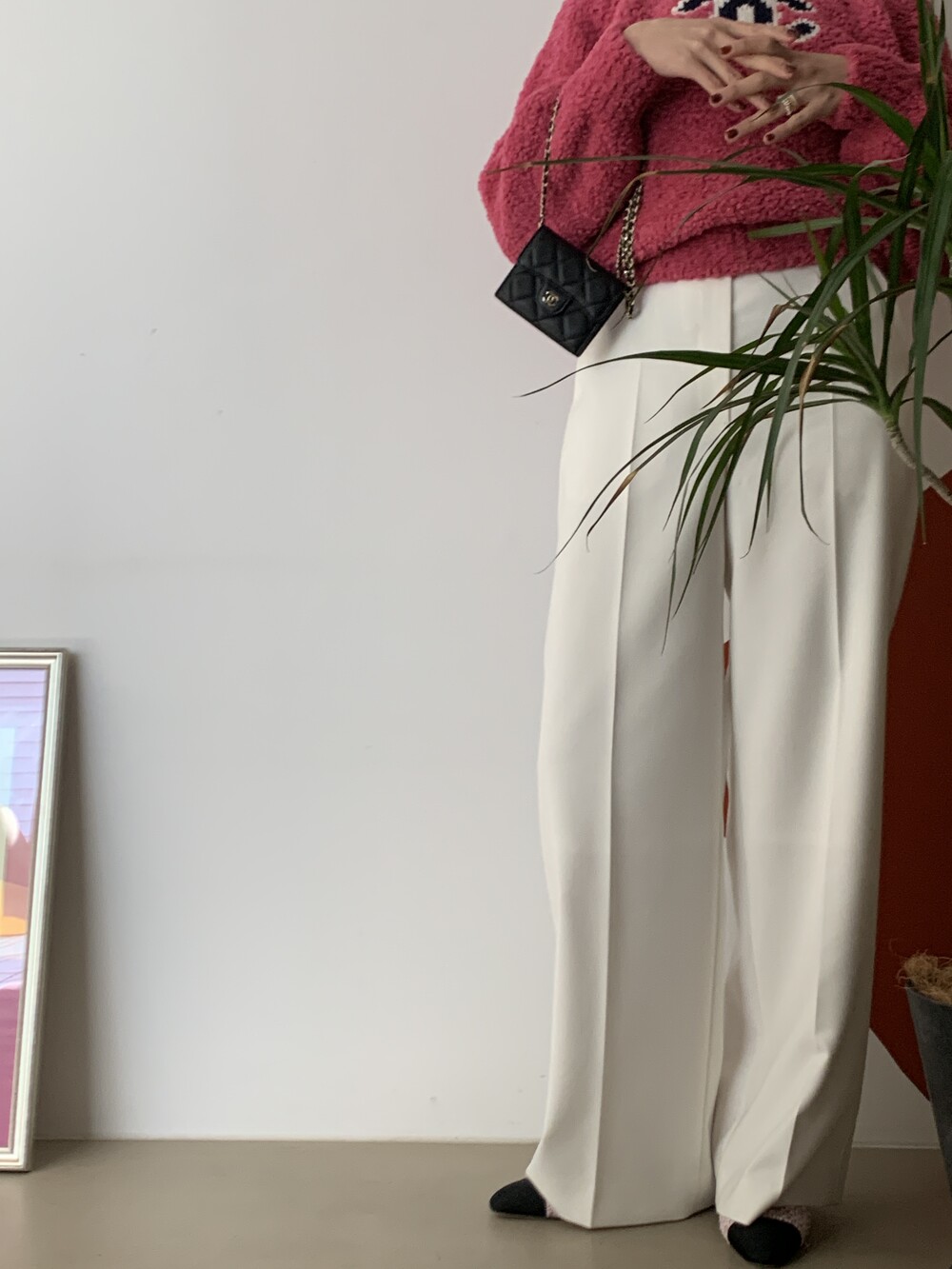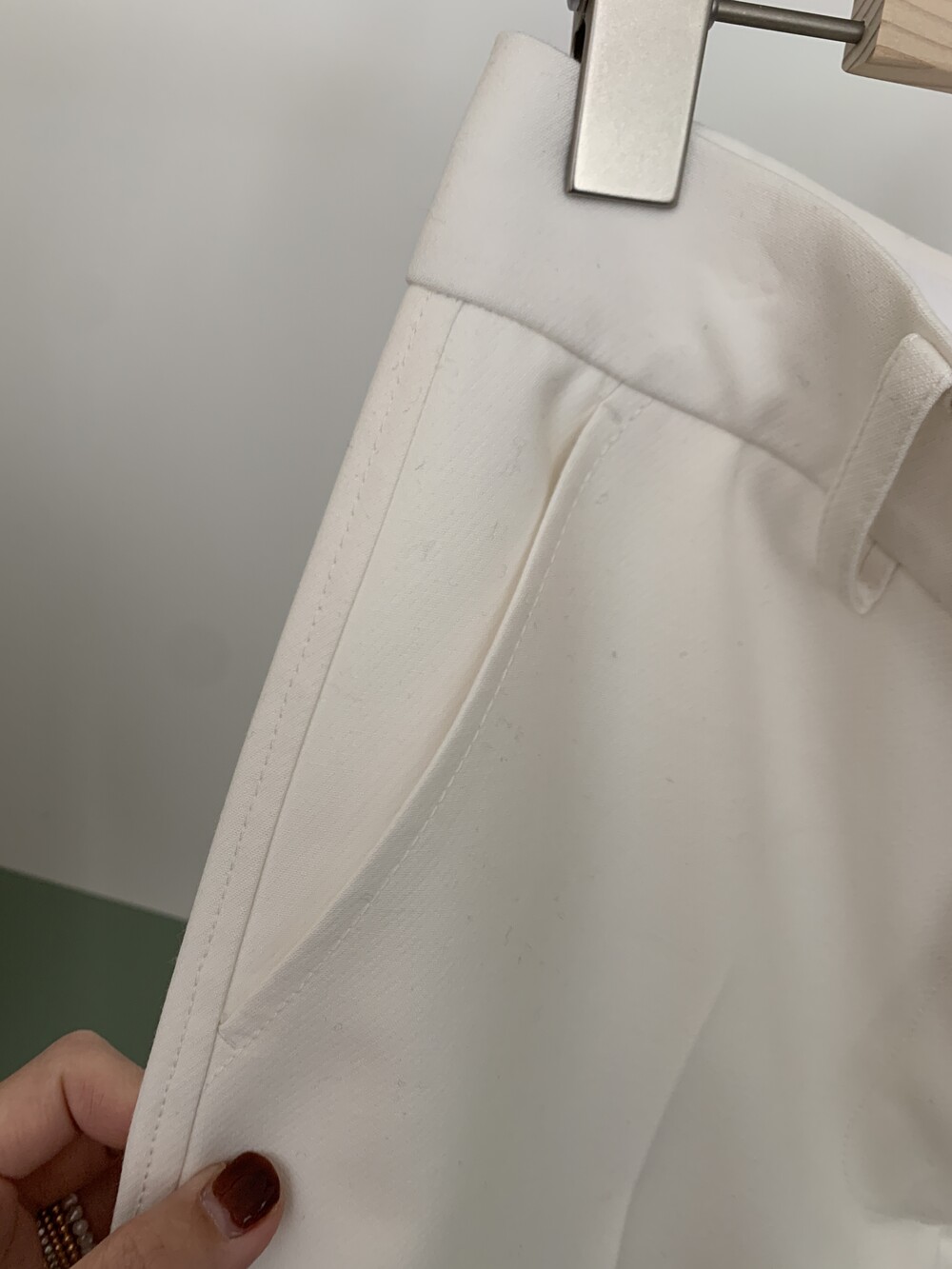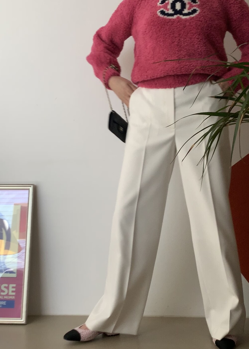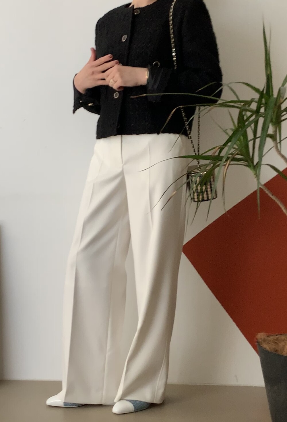 어떠한 상의에 매치해도 화사함과 우아함을 선사하기에 필수 아이템으로 여겨지는 오프 화이트 색상의 팬츠입니다.