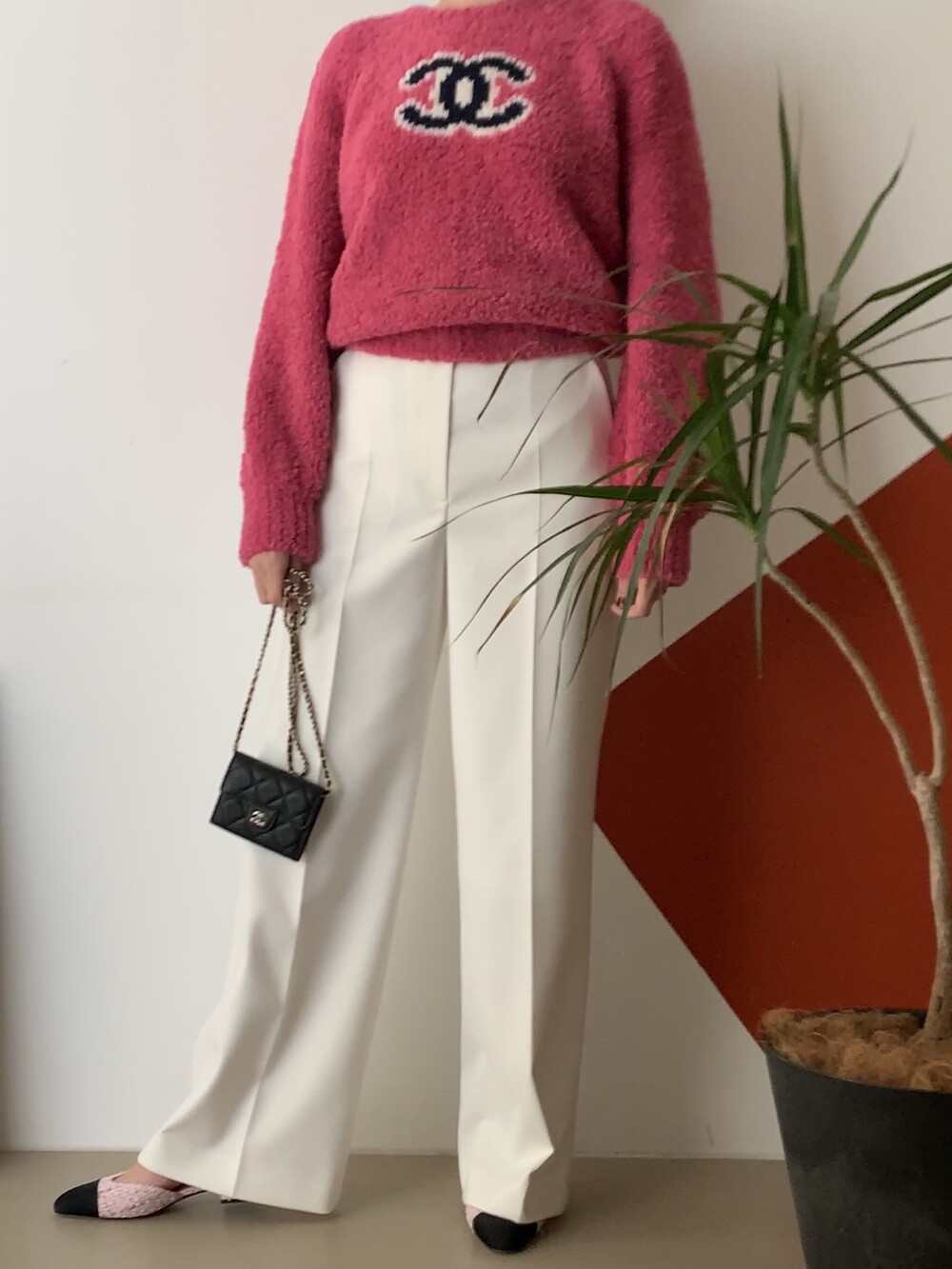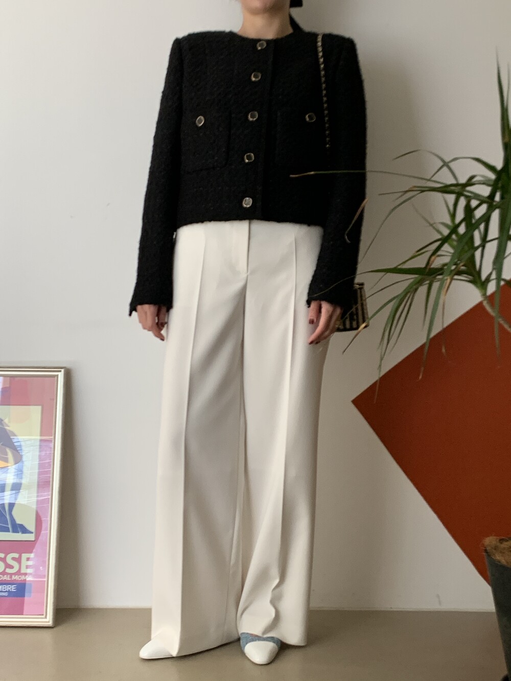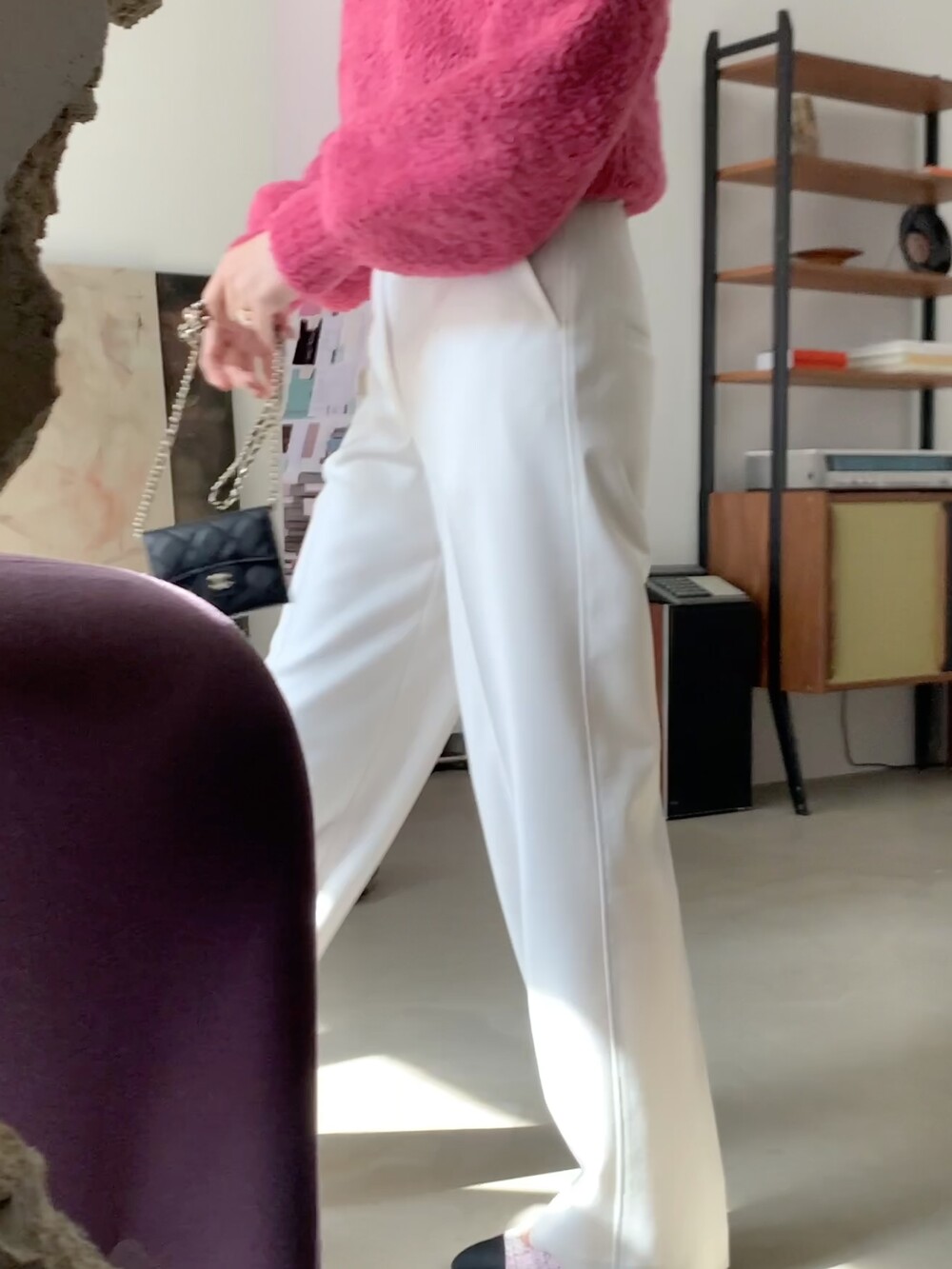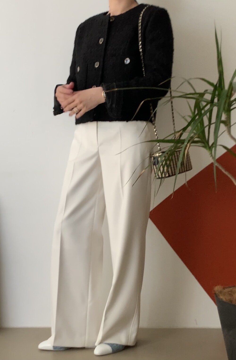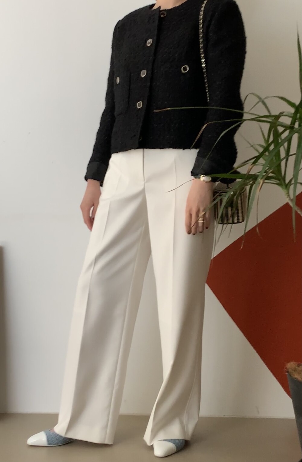 어떠한 상의에 매치해도 화사함과 우아함을 선사하기에 필수 아이템으로 여겨지는 오프 화이트 색상의 팬츠입니다.