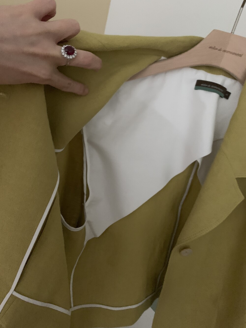 전체 안감이 아닌 날개 우라- 반우라 처리를 하였으며 나머지 시접은 코튼 면 아사 원단으로