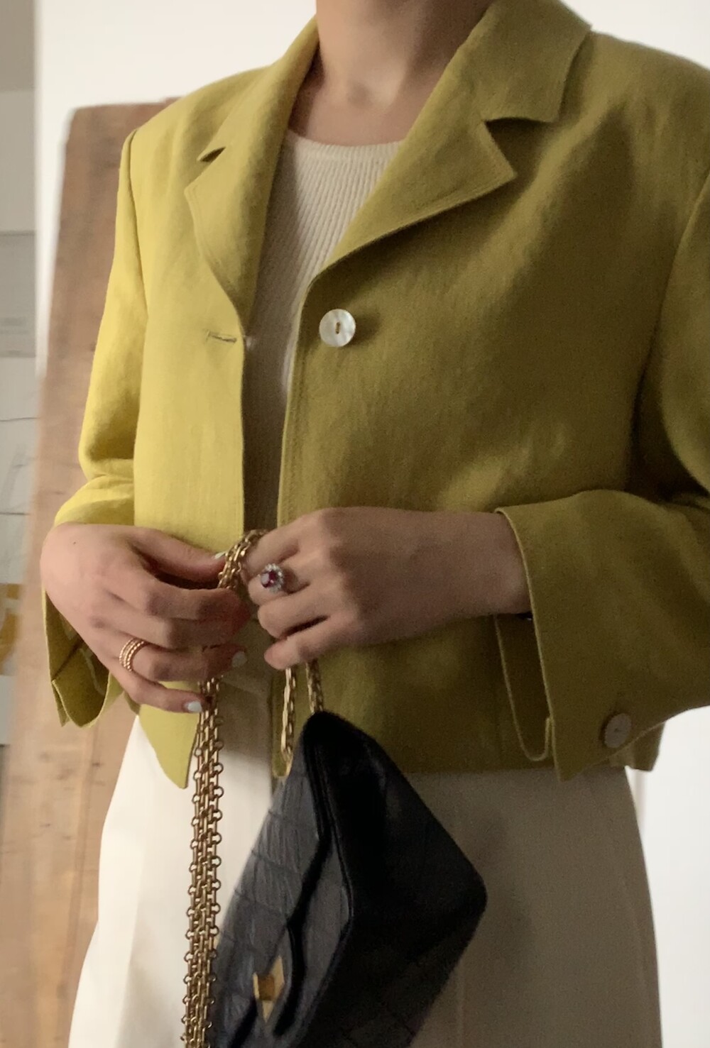 재킷의 소매는 8-9부 소매로 여성미와 함께 봄과 여름의 상쾌한 느낌을 주기 위해