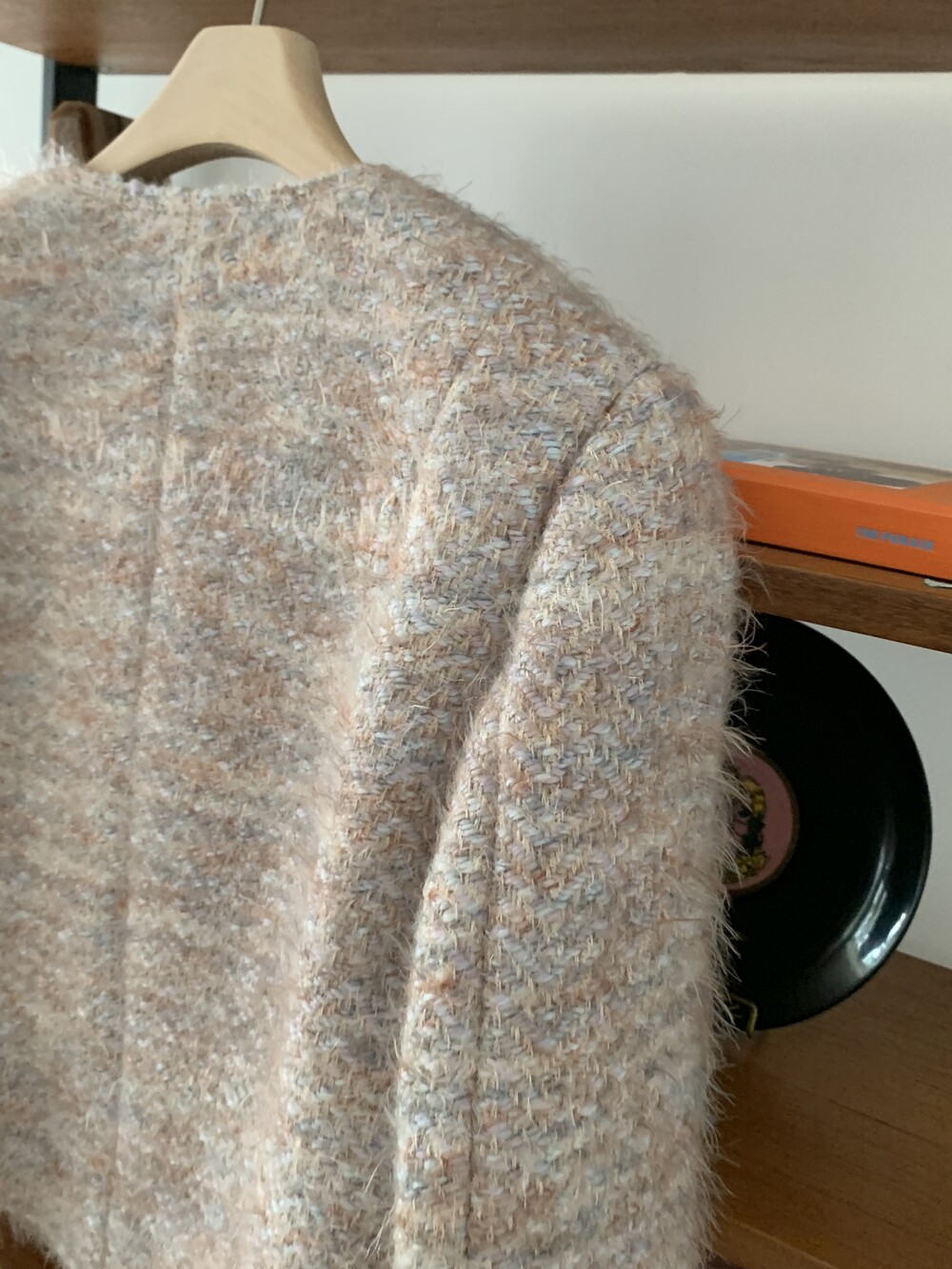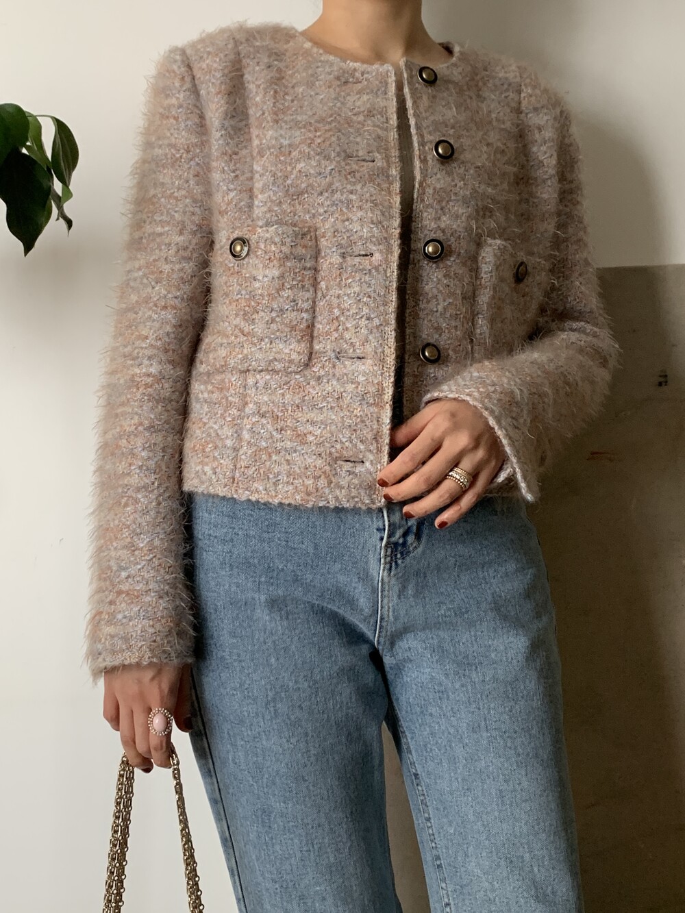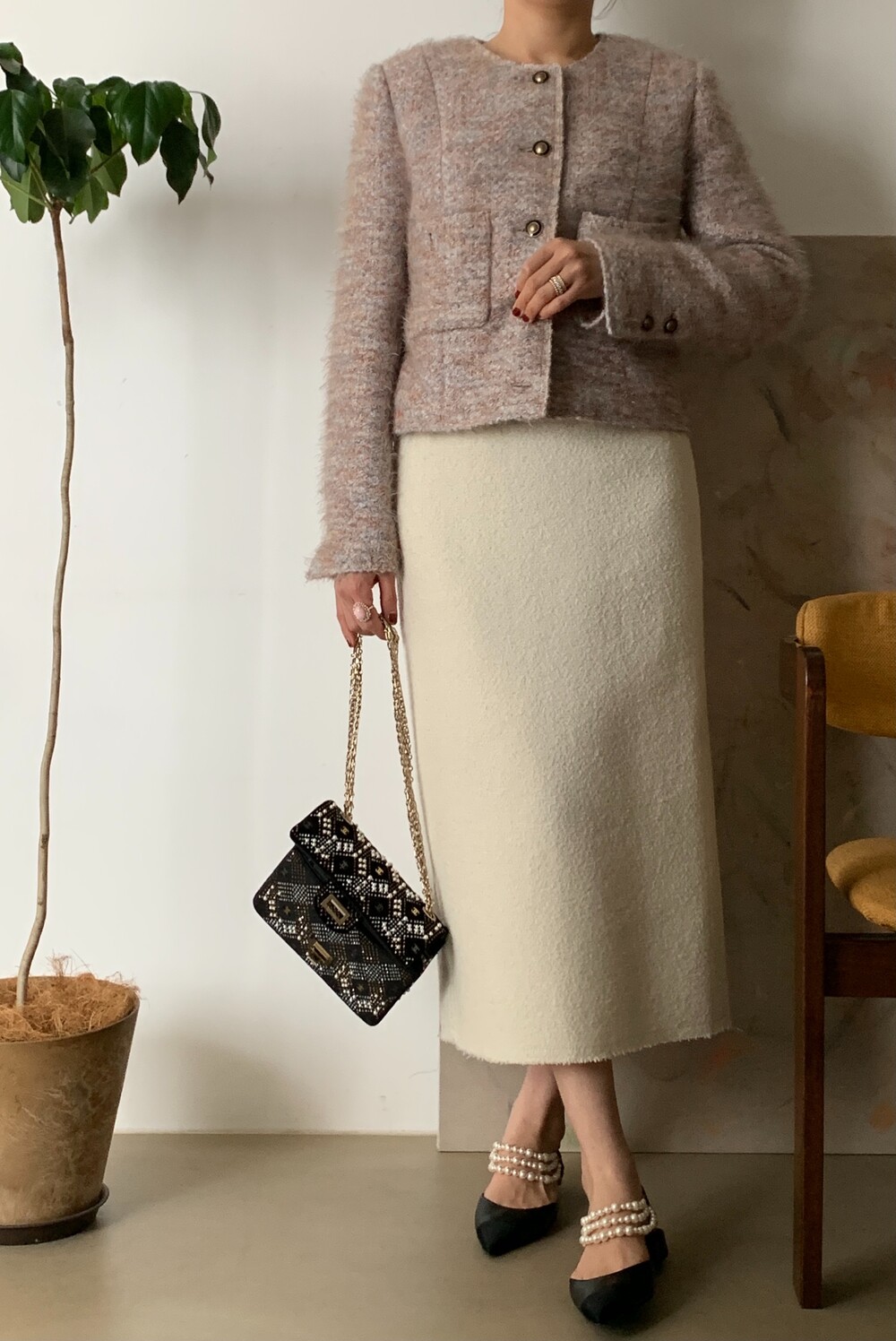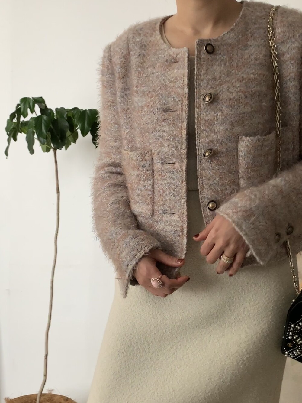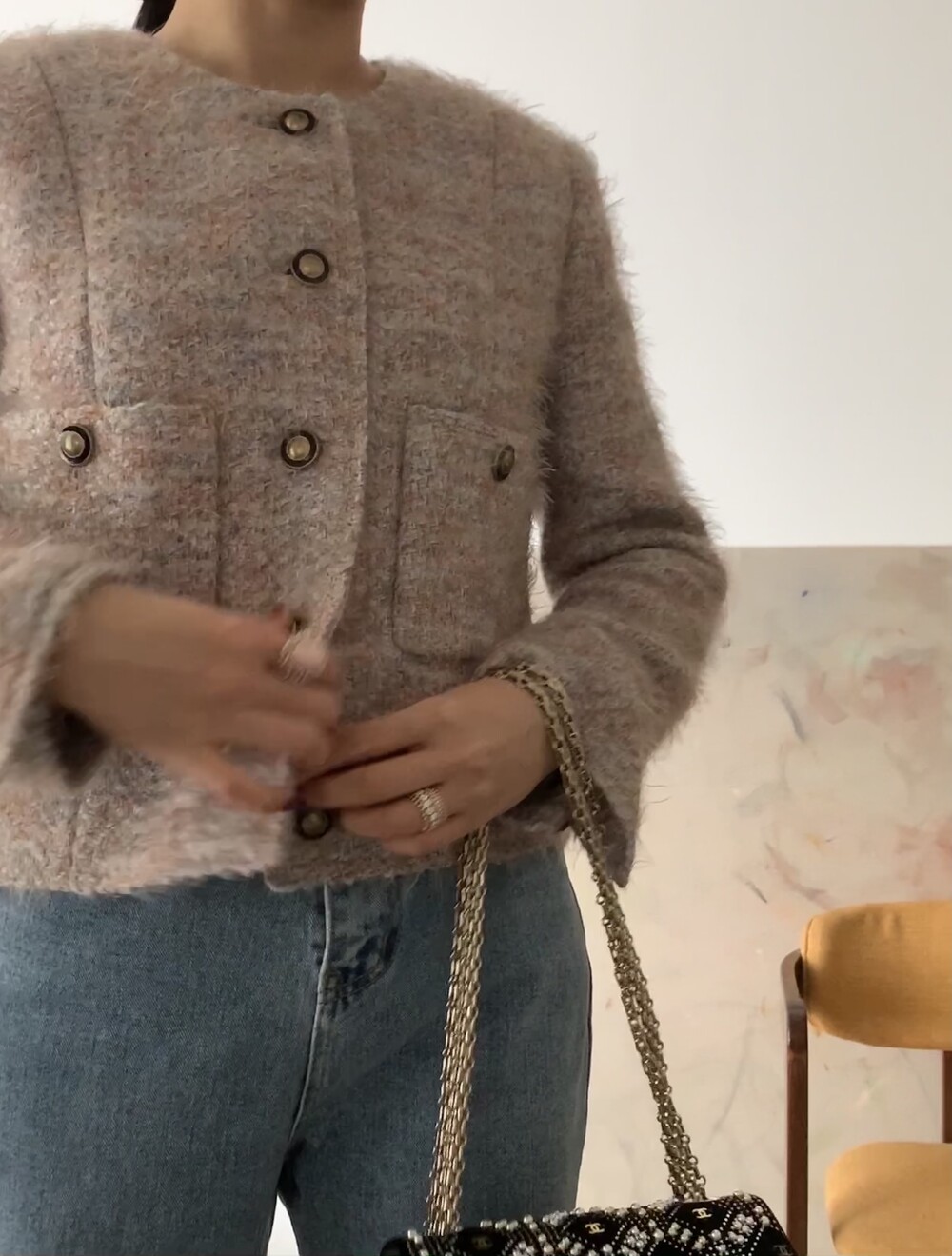 여름을 제외하고 모든 계절 착용 가능한 두께감의 트위드 원단으로 소재의 깊이감에서 느껴지는