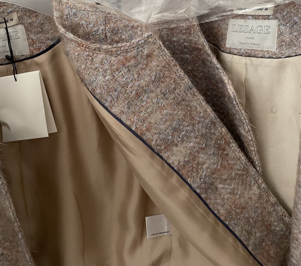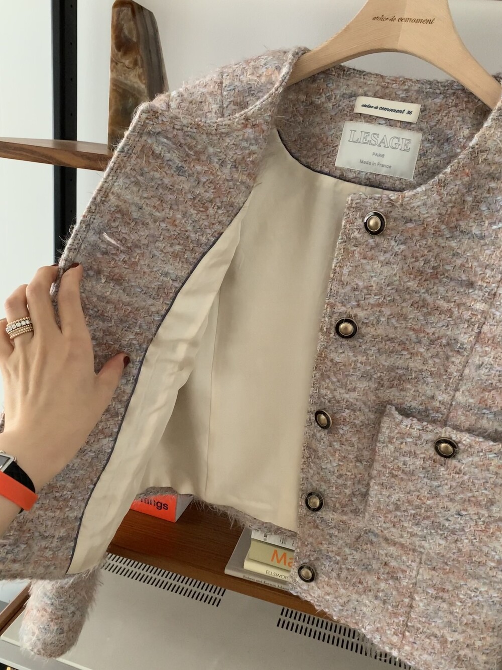 LESAGE 트위드 원단과 실크(silk 100%) 트윌 안감의 결합은 단단함과 섬세함을 동시에 느낄 수 있게 합니다.