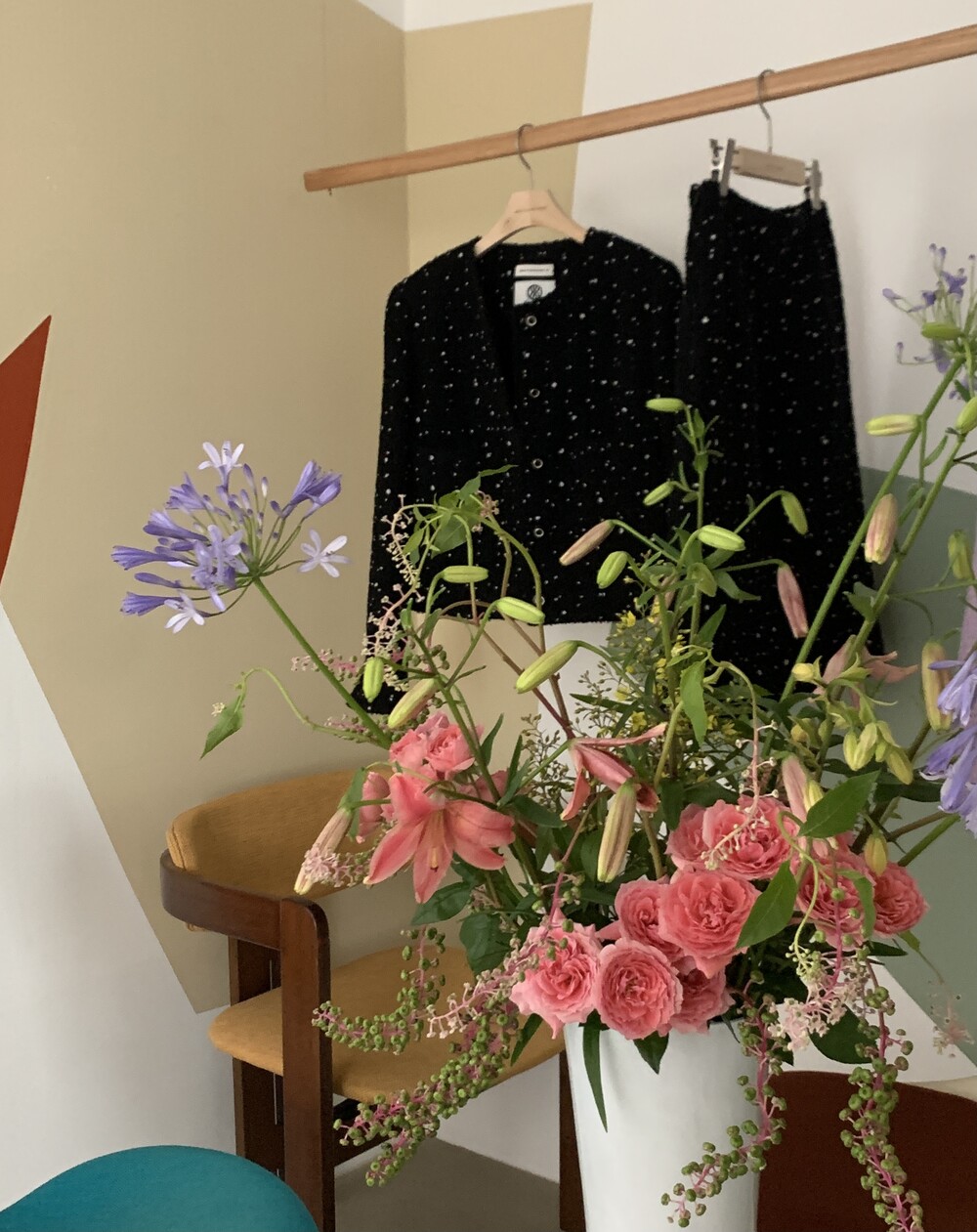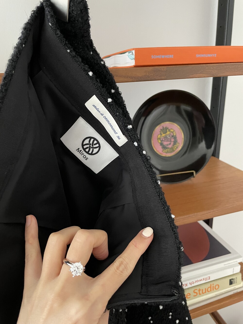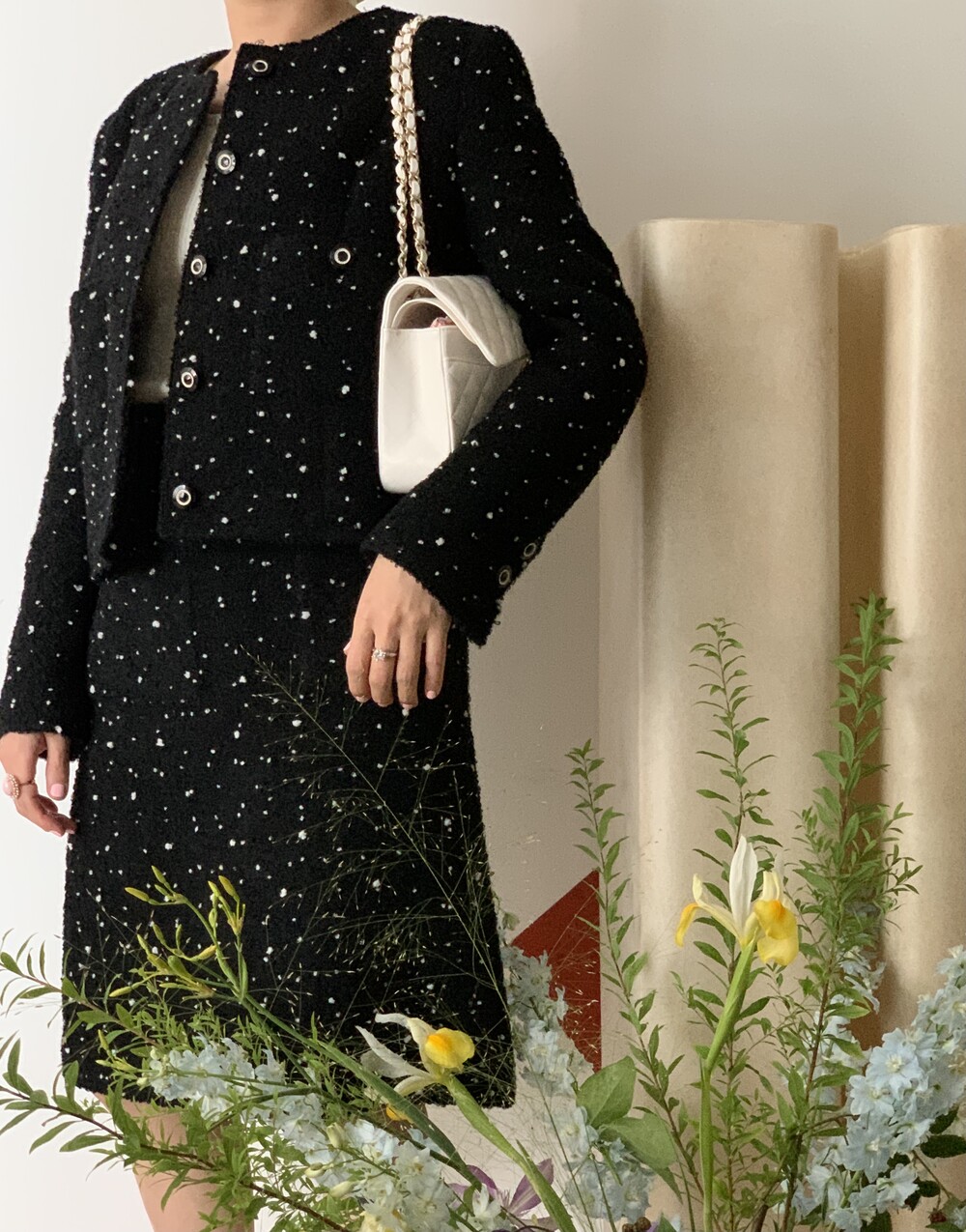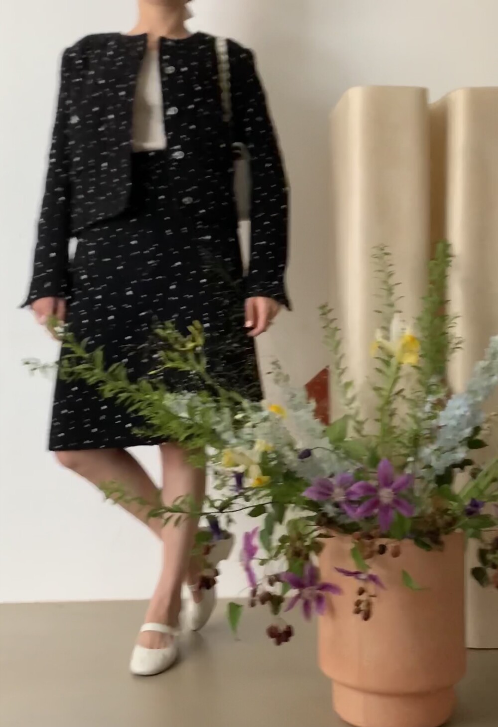 여름을 제외하고 모든 계절 착용 가능한 두께감의 트위드 원단으로 소재의 깊이감에서 느껴지는