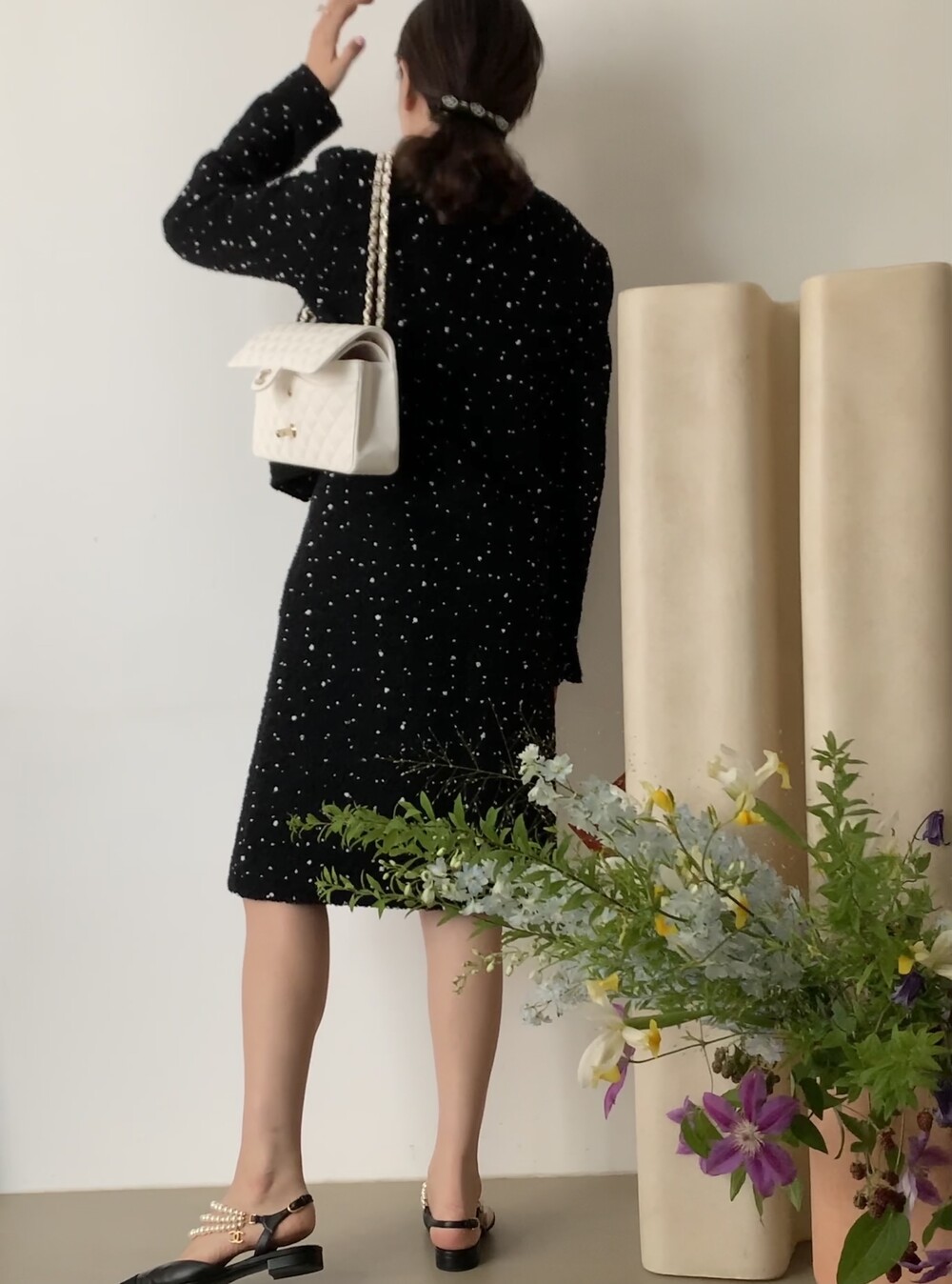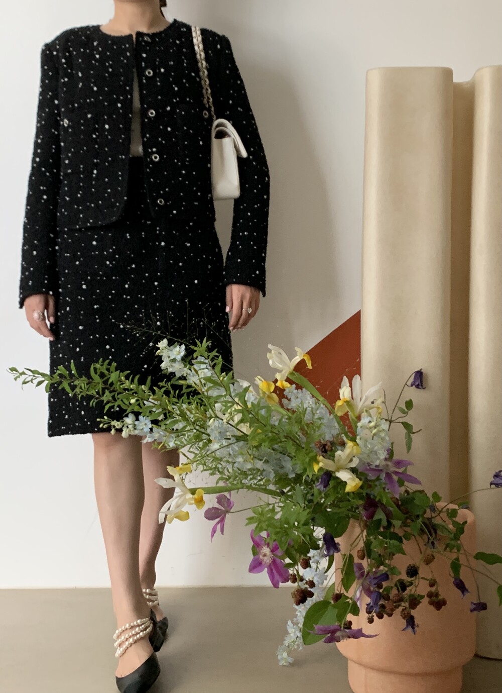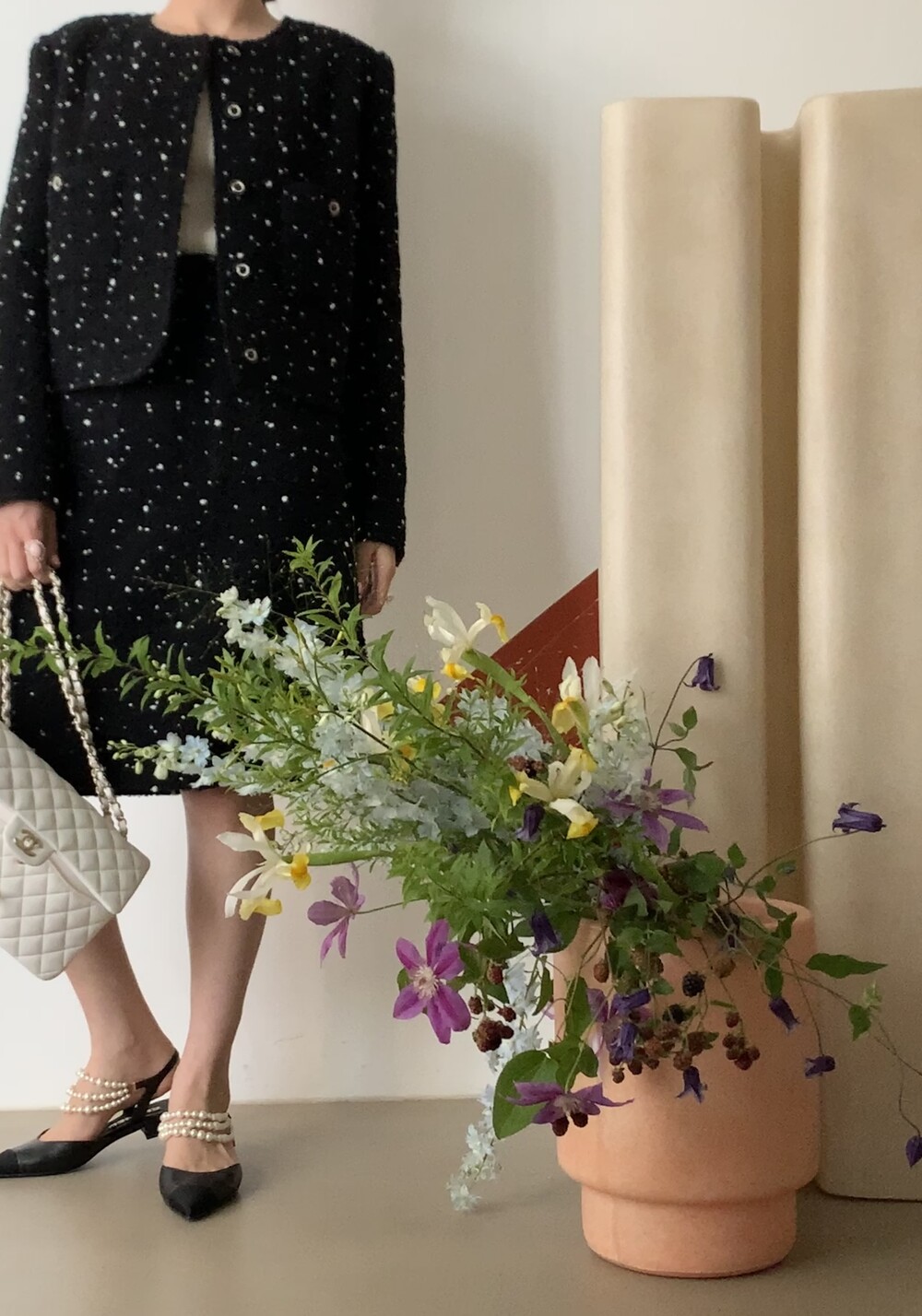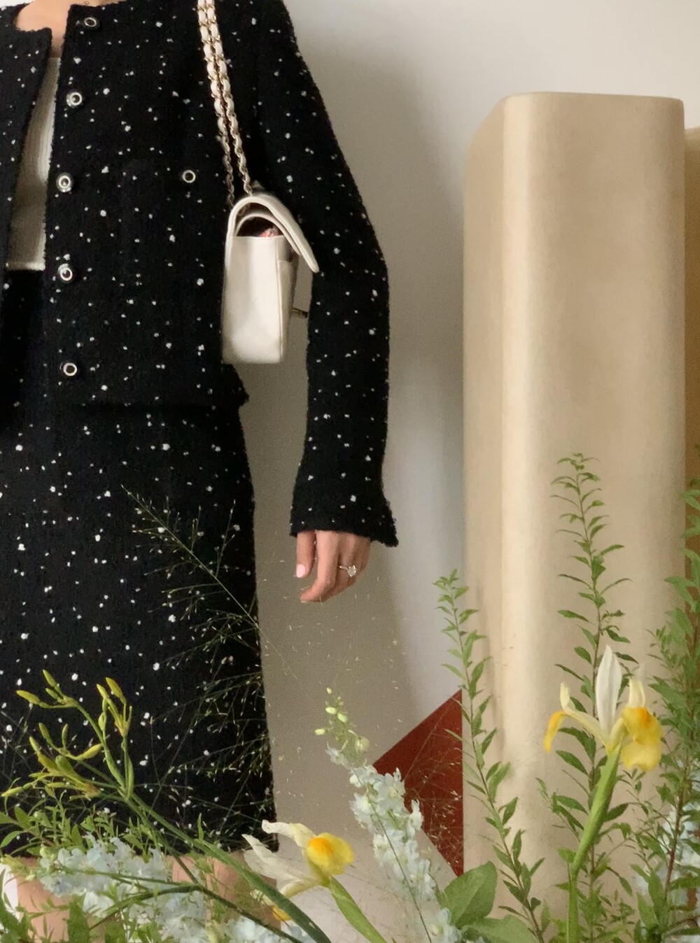 여름을 제외하고 모든 계절 착용 가능한 두께감의 트위드 원단으로 소재의 깊이감에서 느껴지는