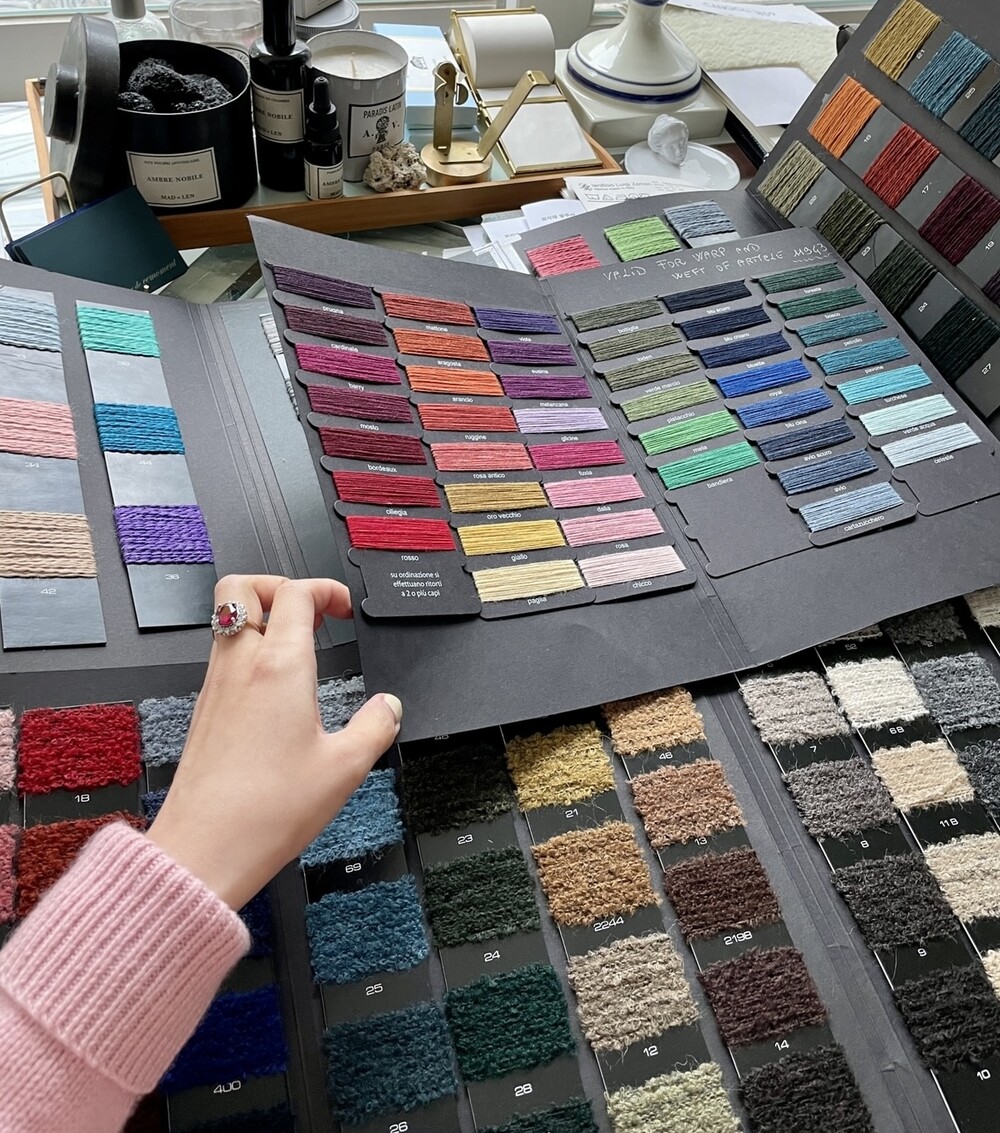 핸드메이드 작업을 통해 원하는 컬러의 원사 하나하나를 테스트하고 의뢰하여 셀렉 해 엮은 원단으로