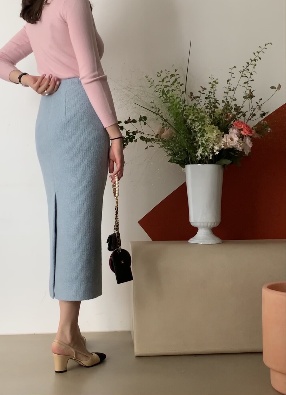 슬릿 기장은 38.5cm 입니다. 스커트 밑단 3cm 여유 분량이 있어 기장 수선 가능한 디자인입니다