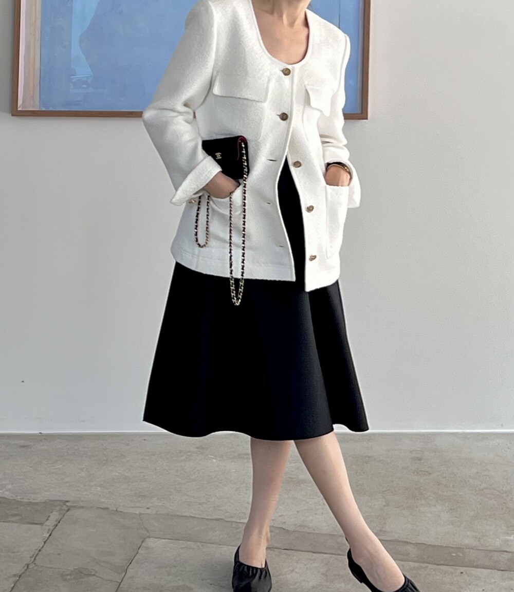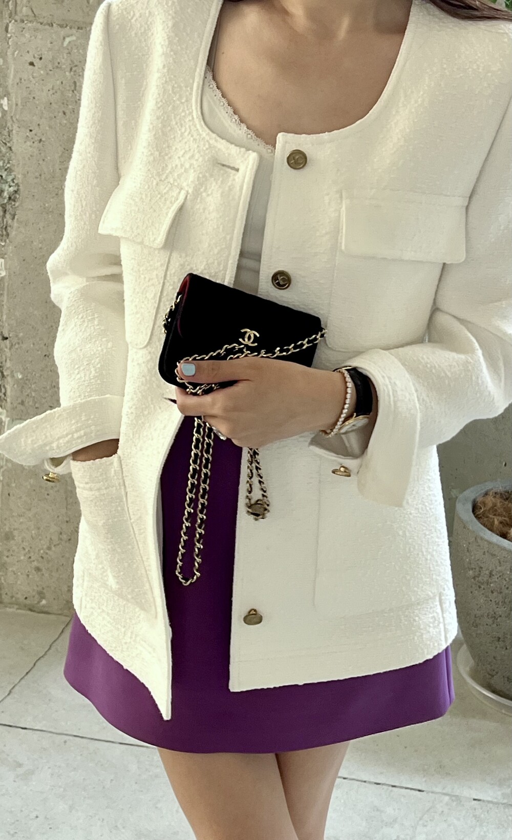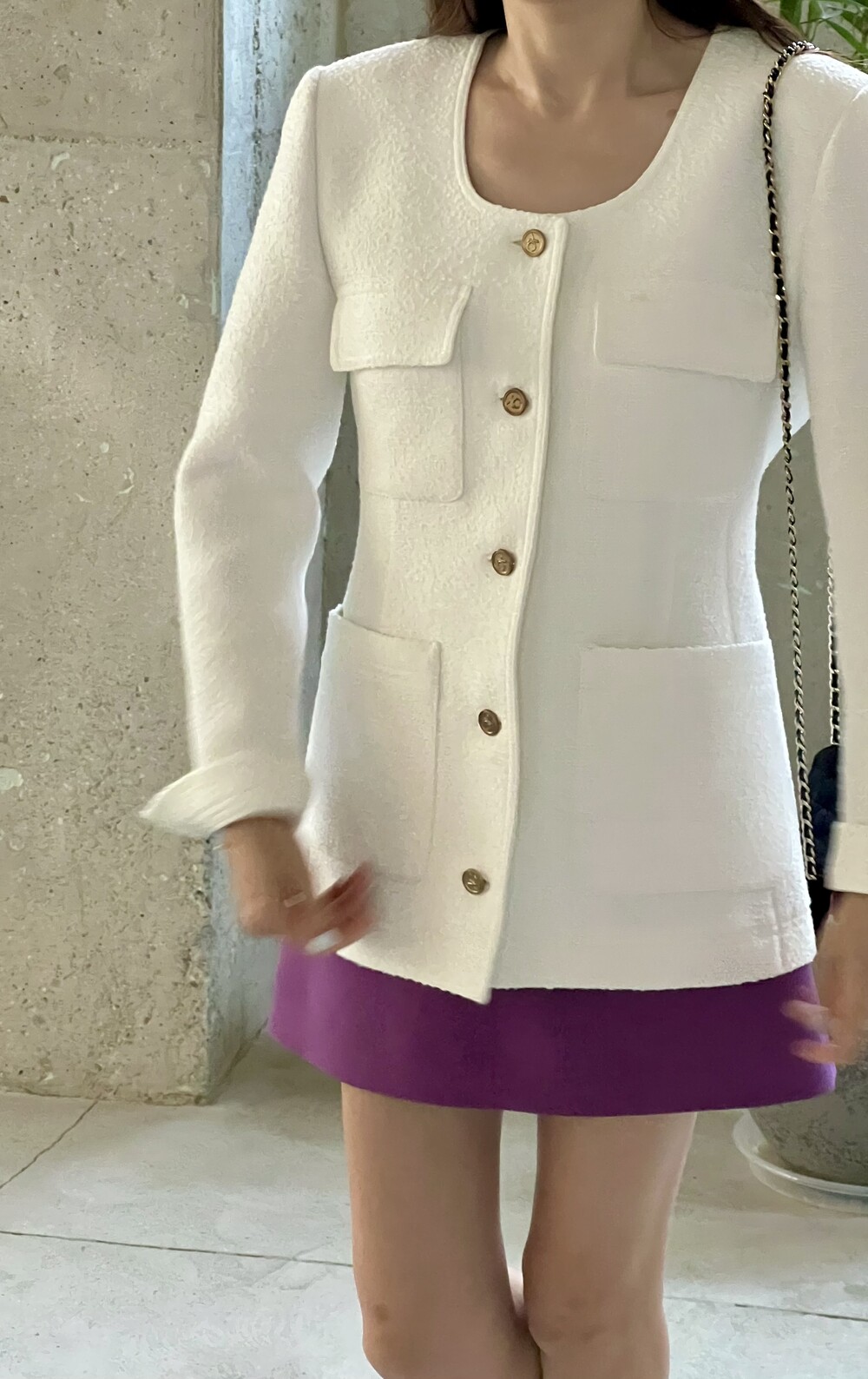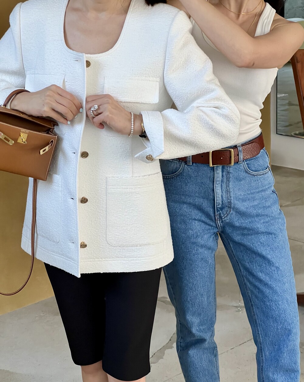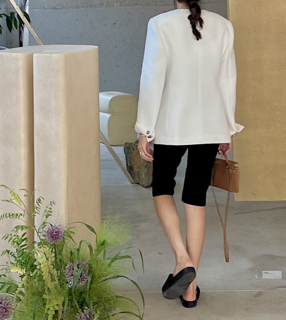 적당한 기장의 스커트, 슬랙스, 데님 등 모든 하의와 매치해도 클래식함과 위트를 잃지 않는 균형감의 자켓입니다.