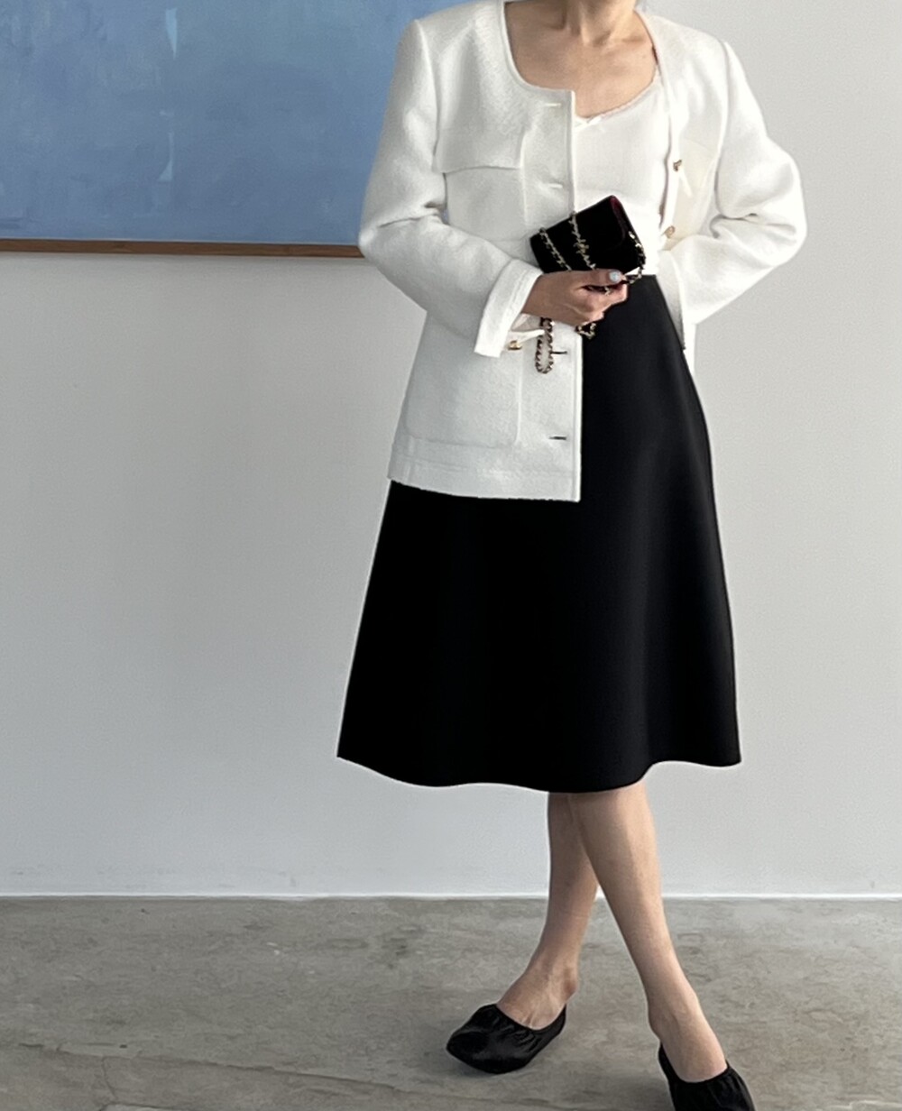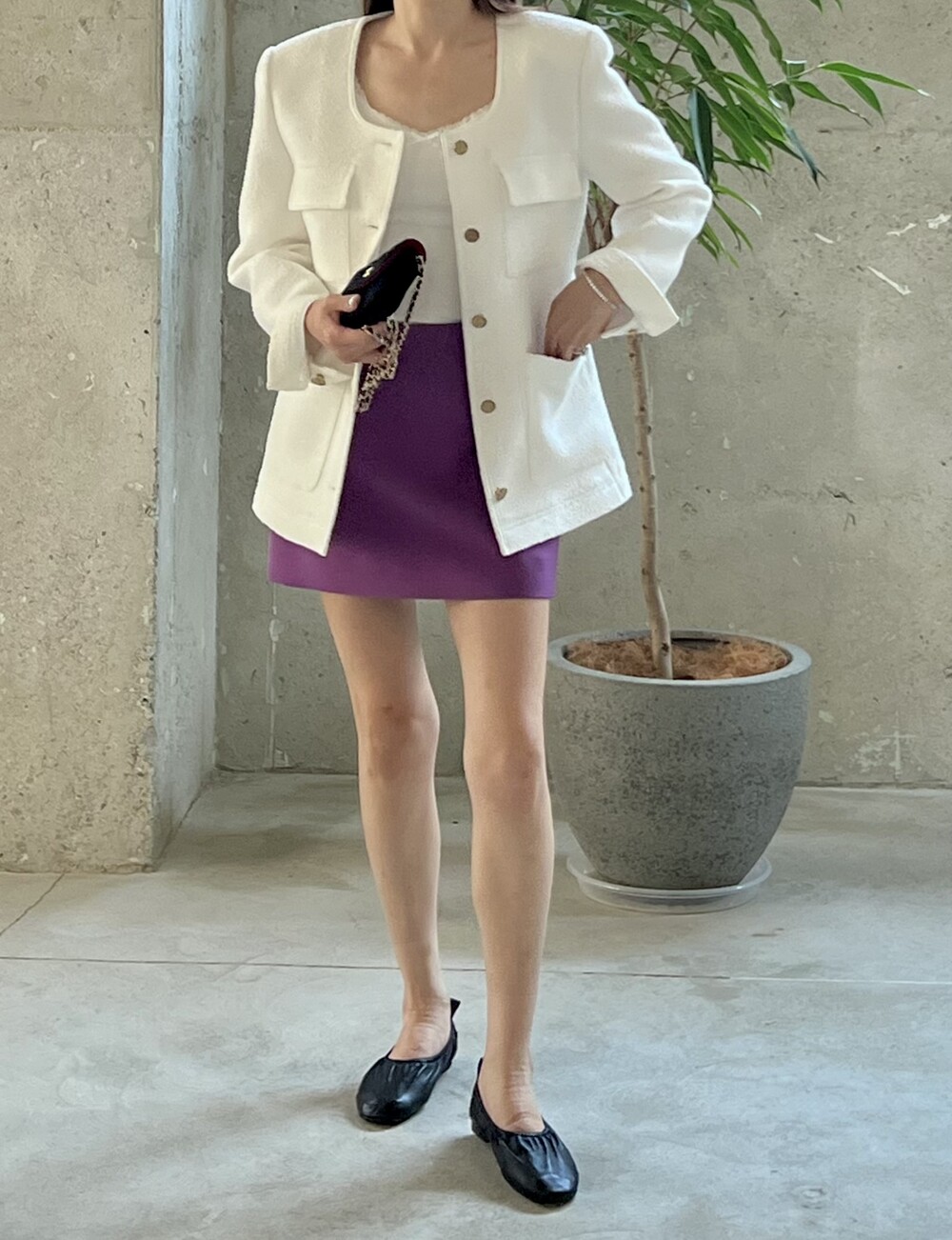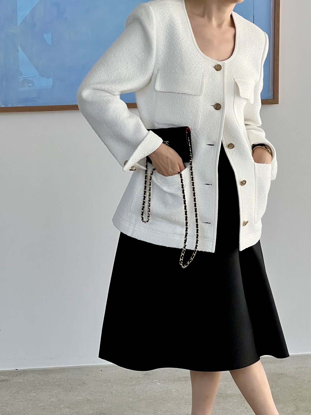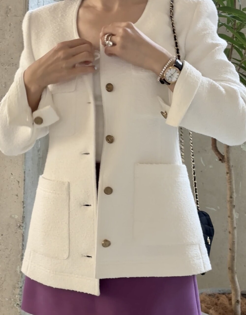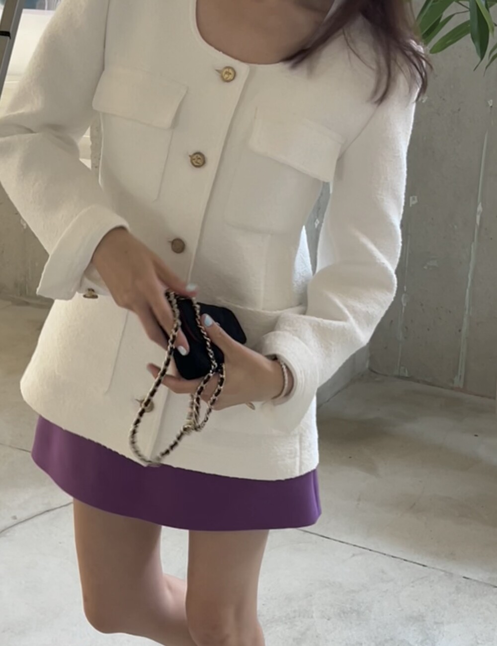 적당한 기장의 스커트, 슬랙스, 데님 등 모든 하의와 매치해도 클래식함과 위트를 잃지 않는 균형감의 자켓입니다.