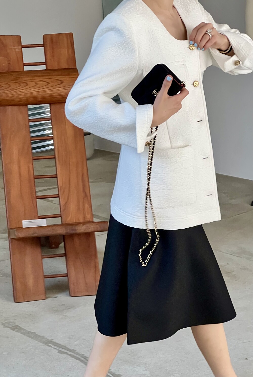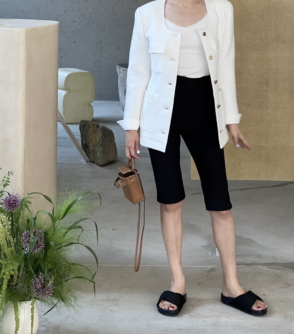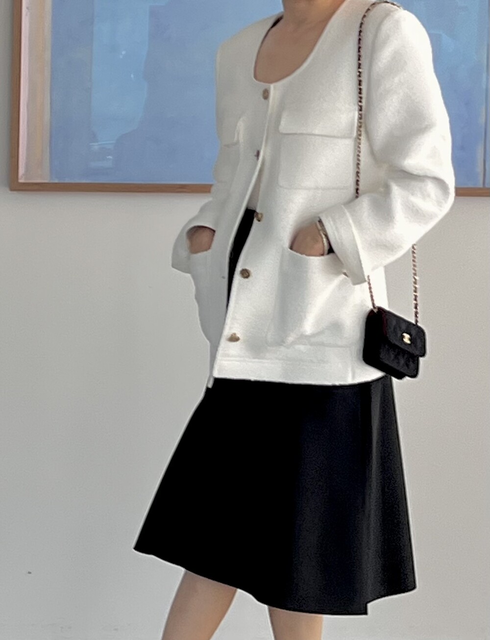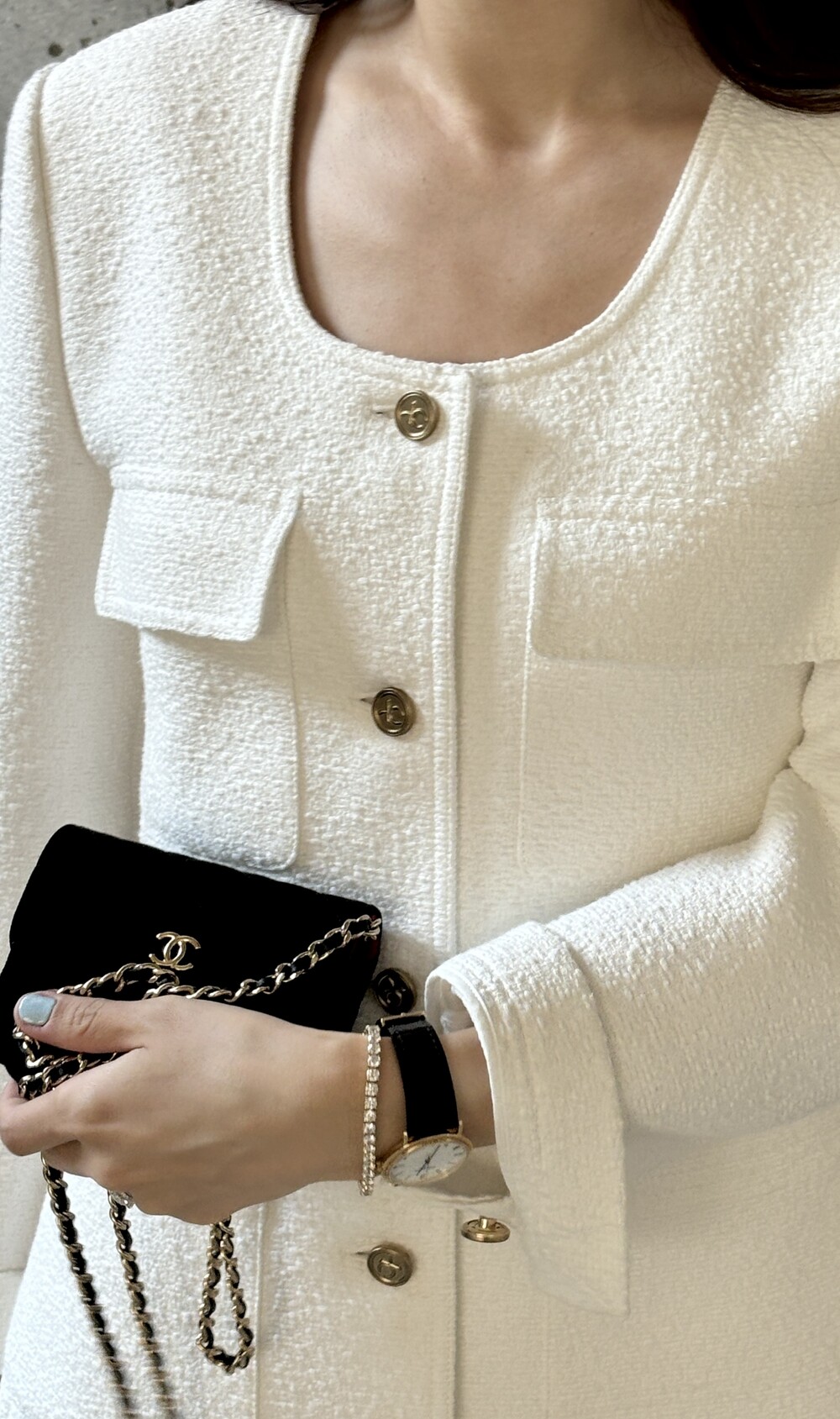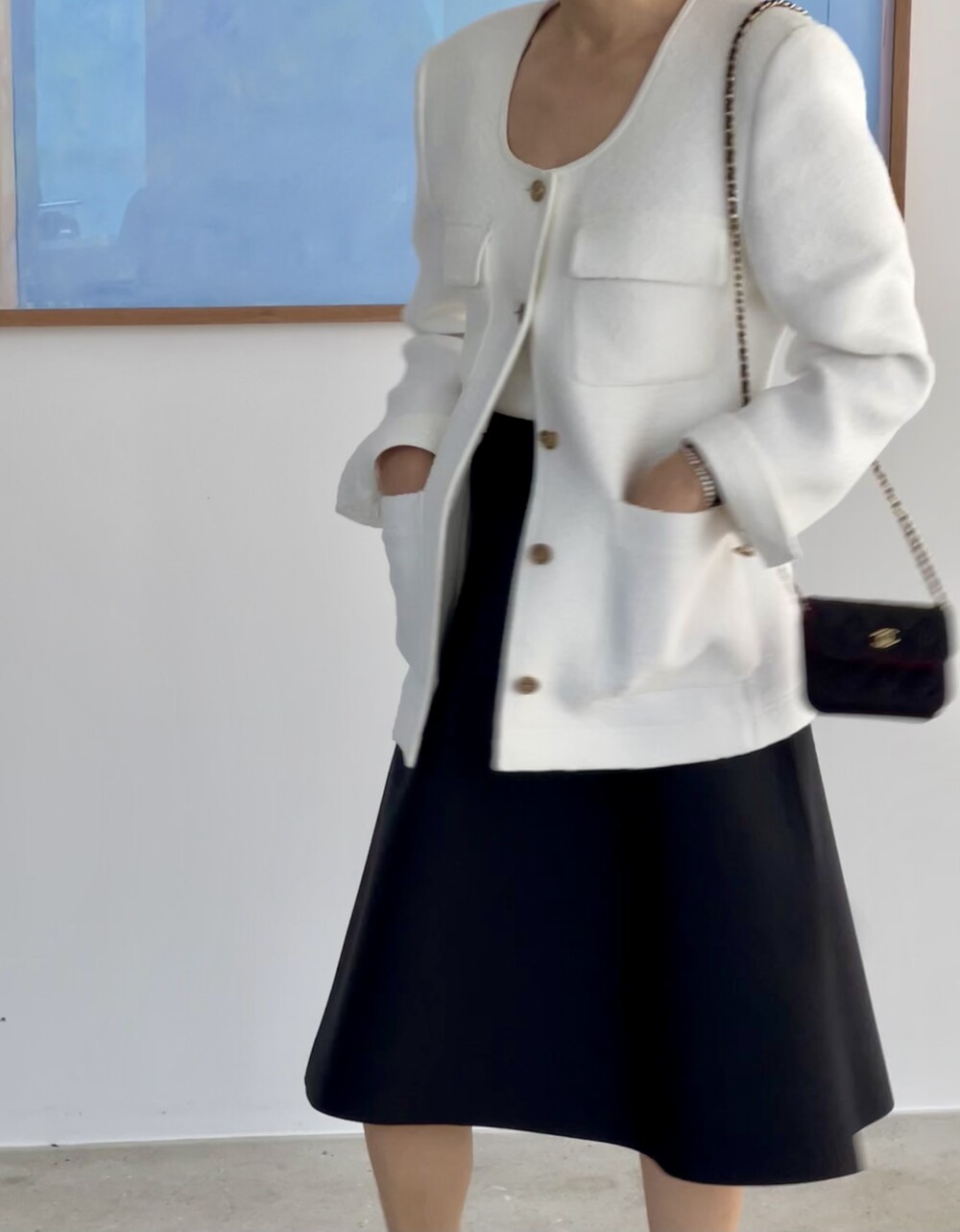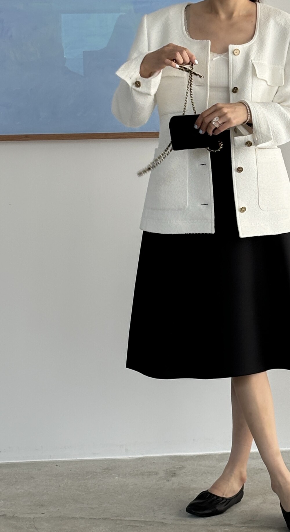 적당한 기장의 스커트, 슬랙스, 데님 등 모든 하의와 매치해도 클래식함과 위트를 잃지 않는 균형감의 자켓입니다.