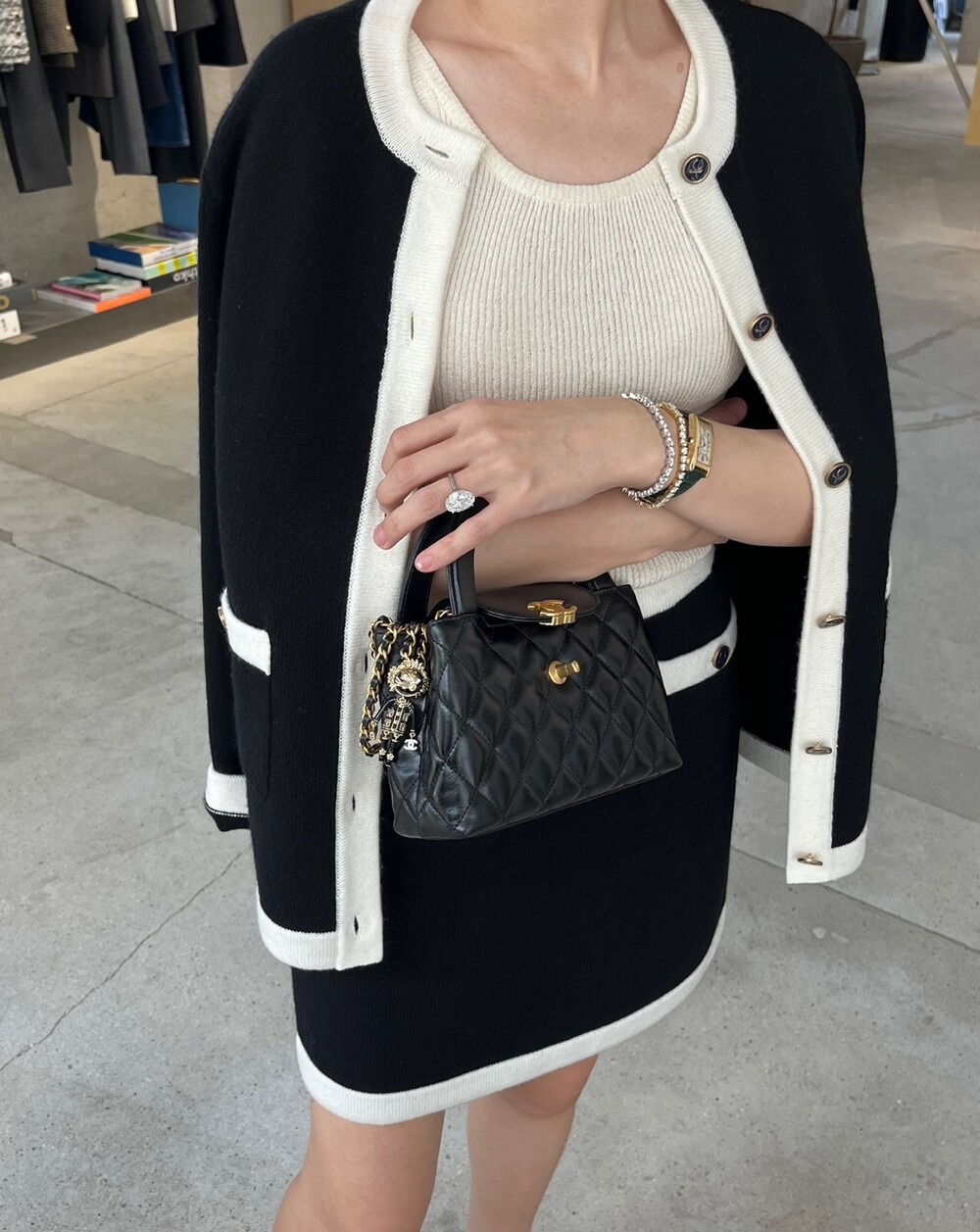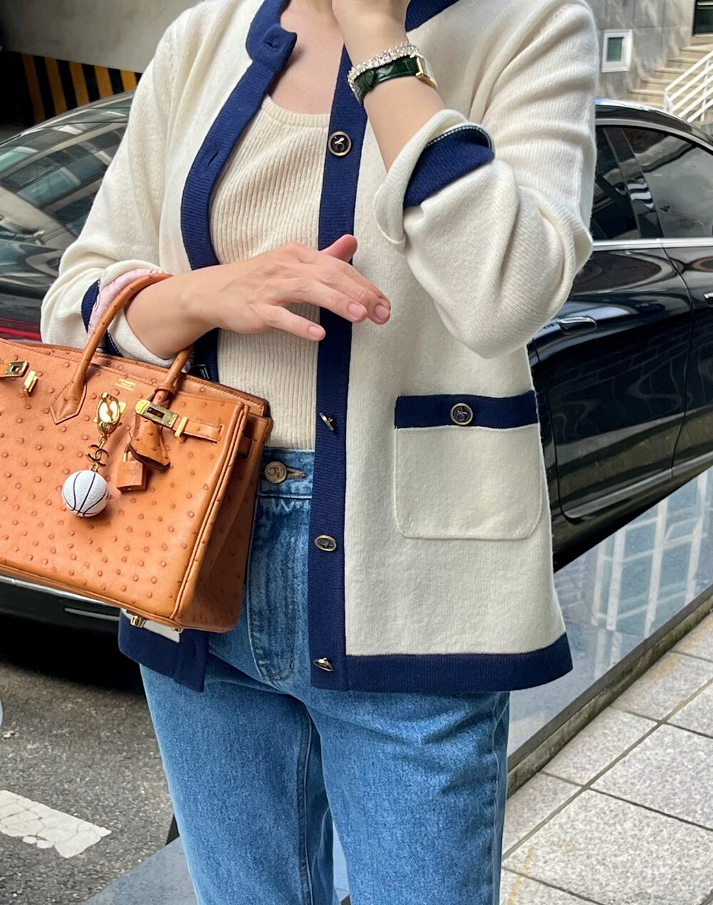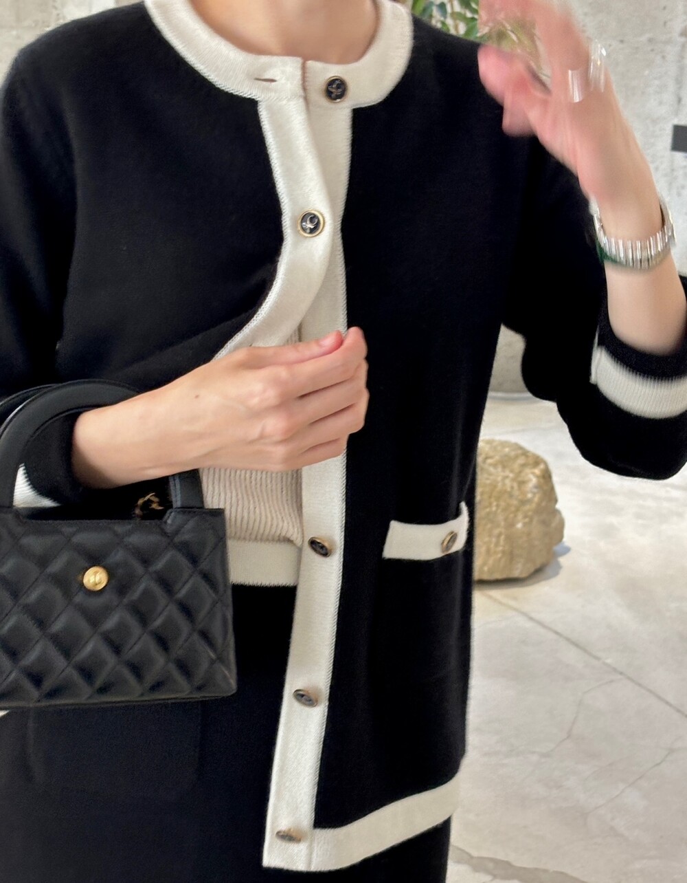 최고급 캐시미어 원사를 사용하여 제작된 고급스러운 카디건 & 스커트 셋업은