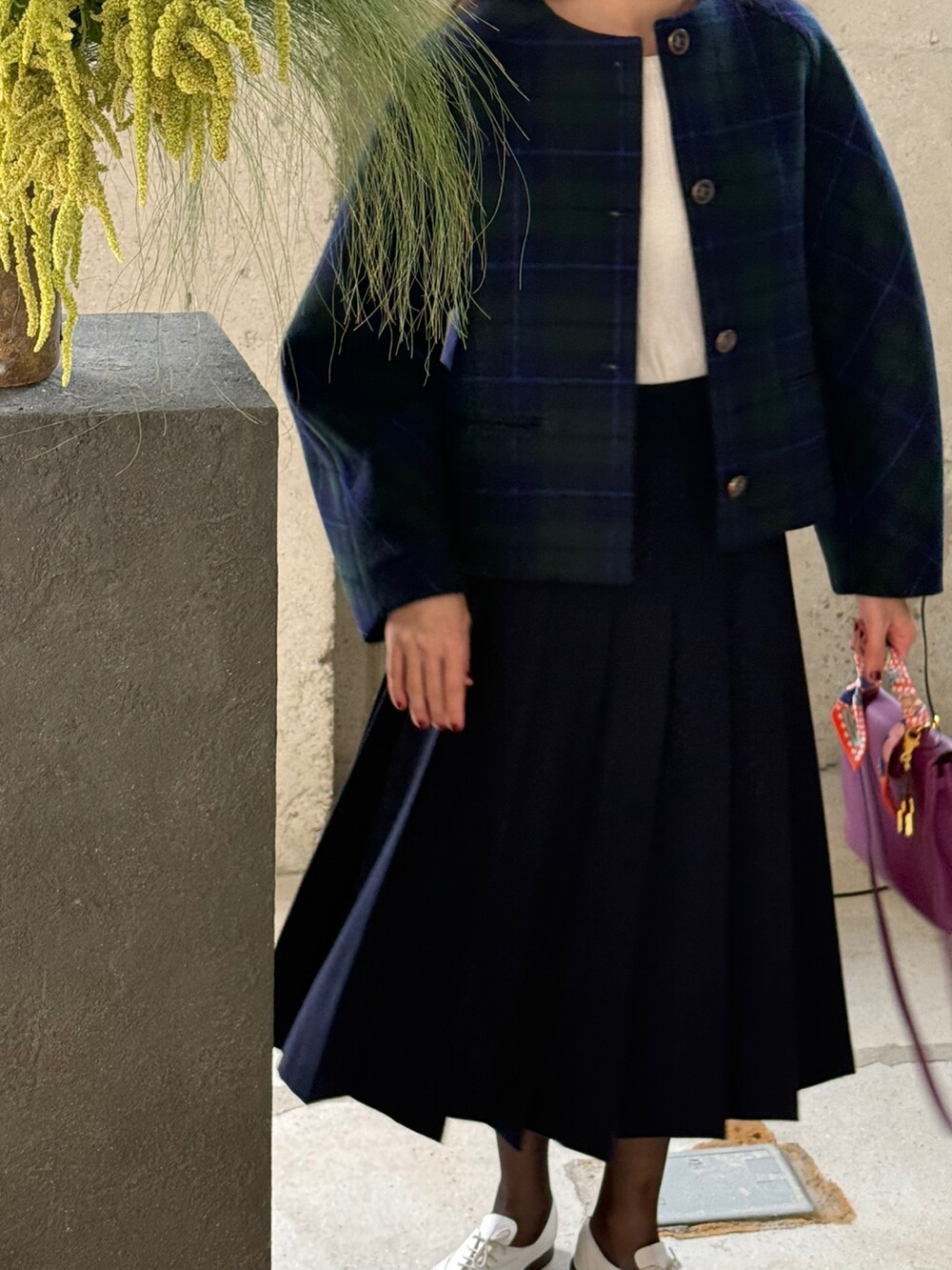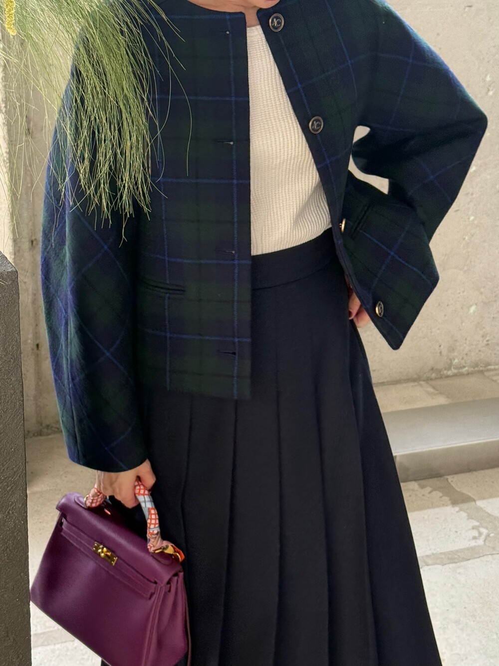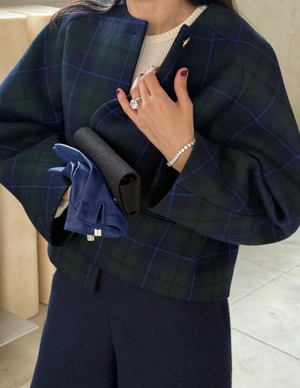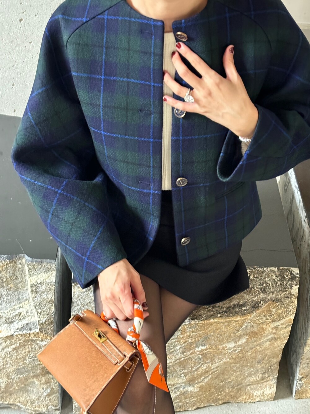 과하지 않은 컬러 조합의 체크 패턴을 사용하여 클래식하면서도 편안하게 입을 수 있는 노카라 재킷입니다.
