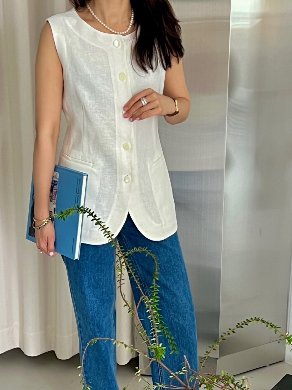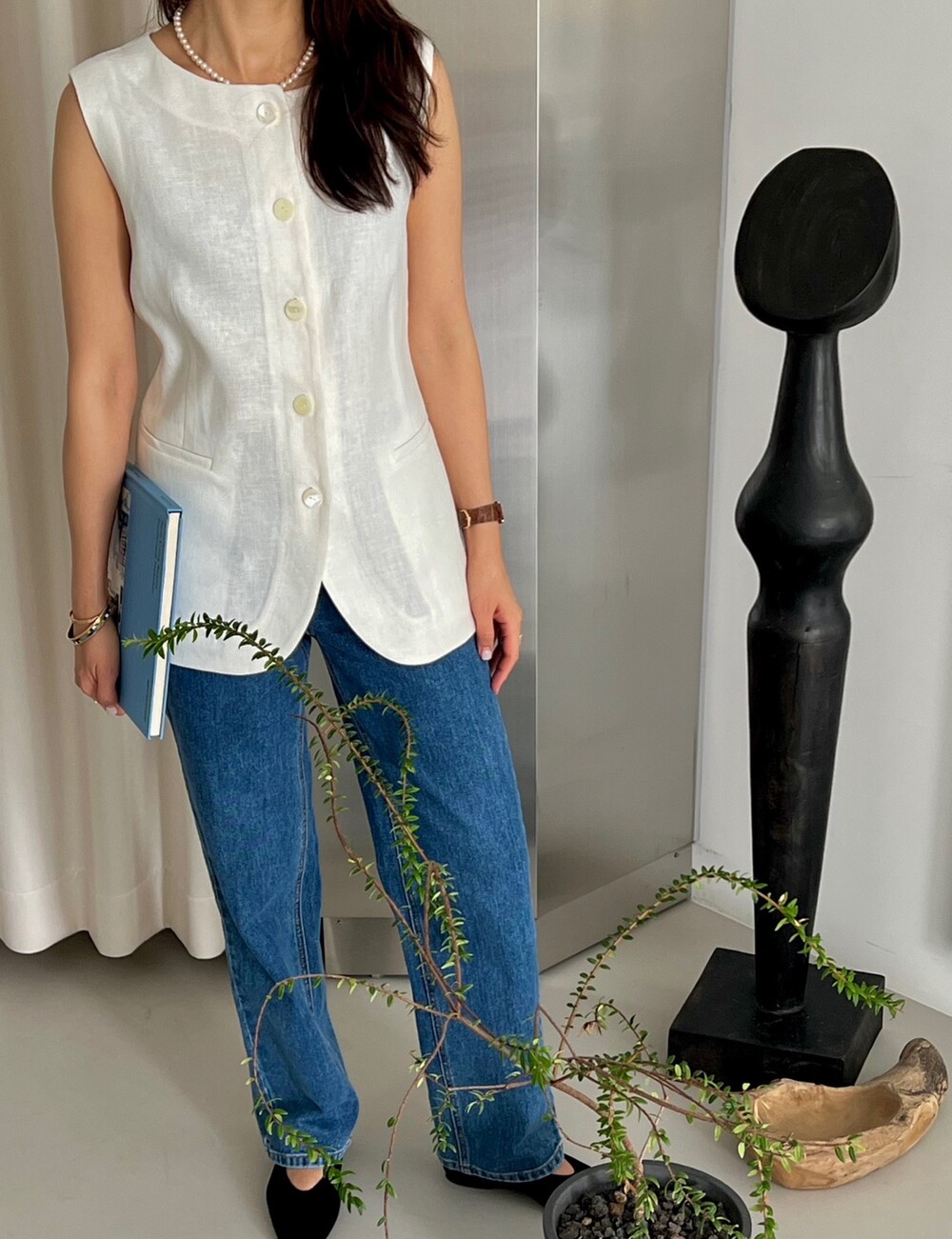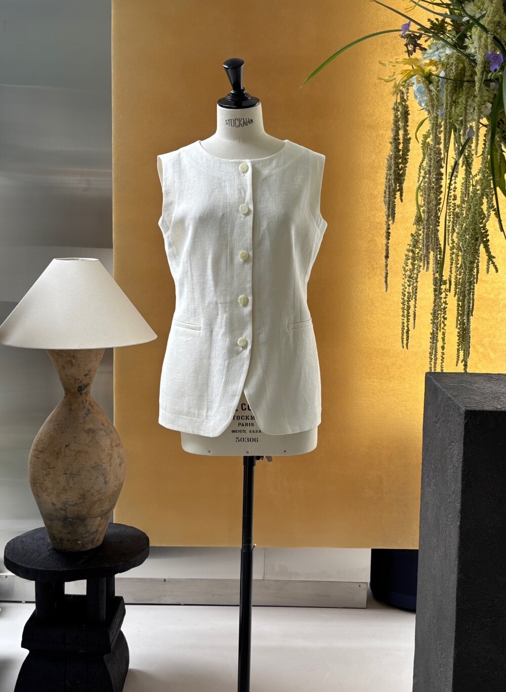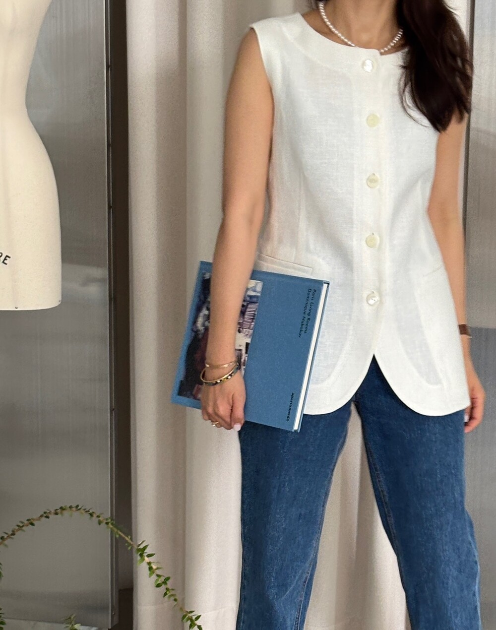 슬림하고 간결한 세미 핏의 실루엣을 가진 단정한 슬리브리스 베스트로,