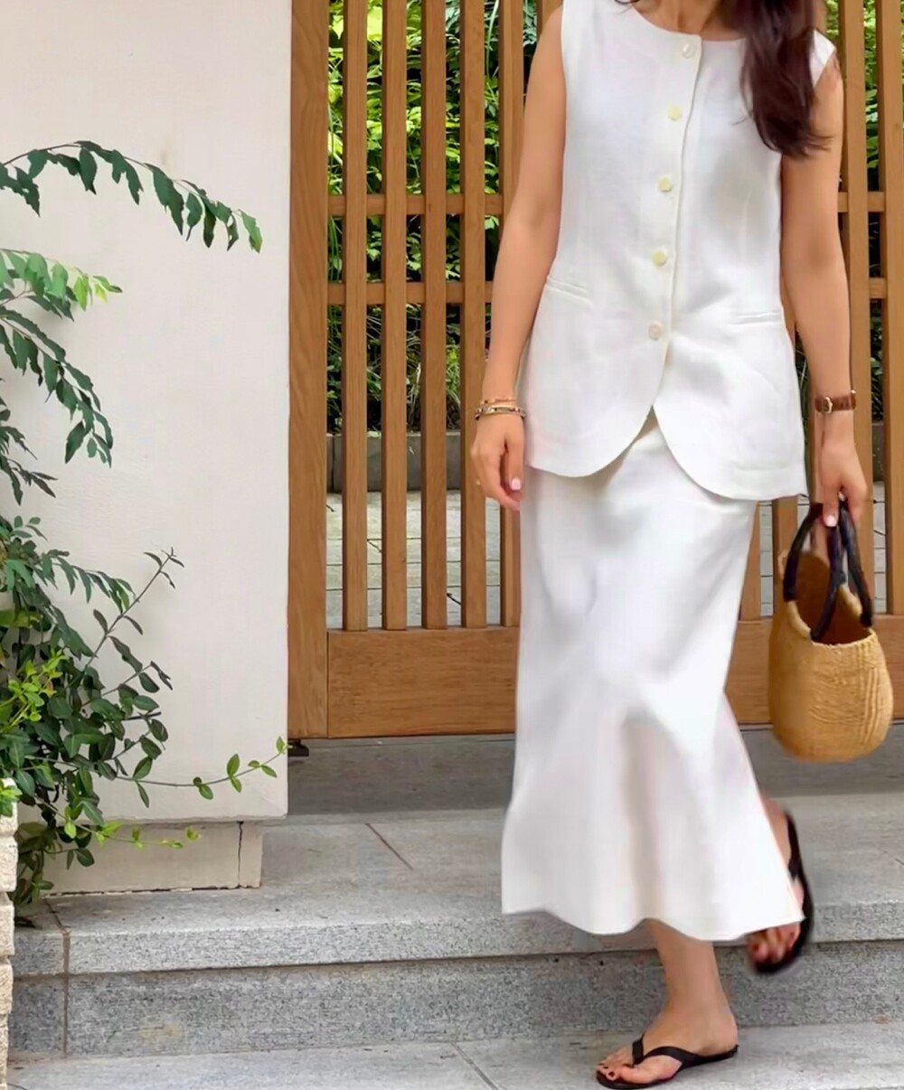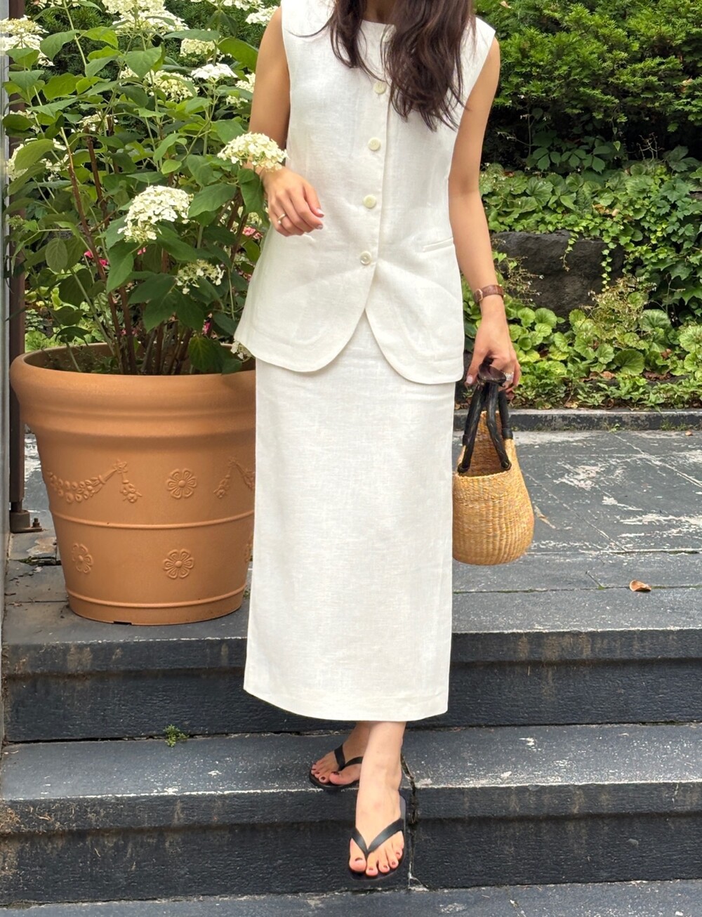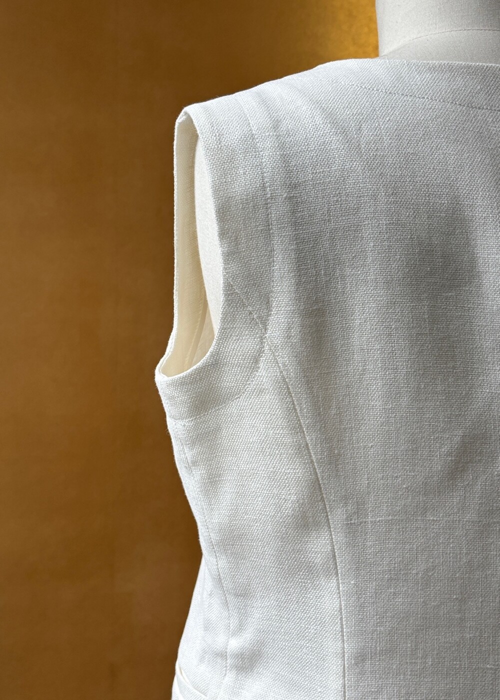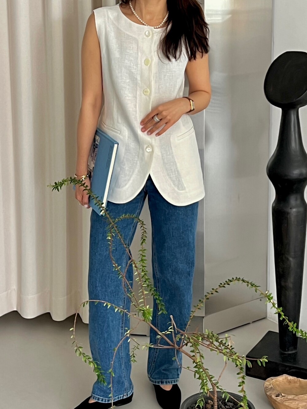 슬림하고 간결한 세미 핏의 실루엣을 가진 단정한 슬리브리스 베스트로,