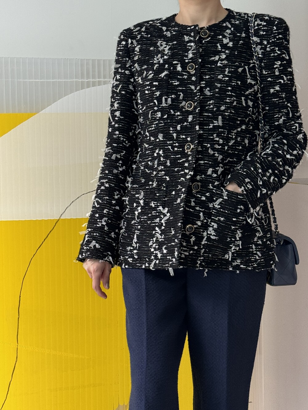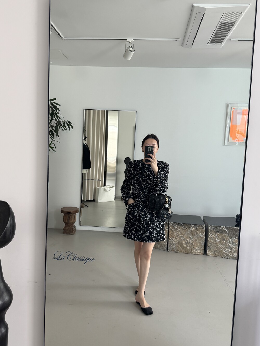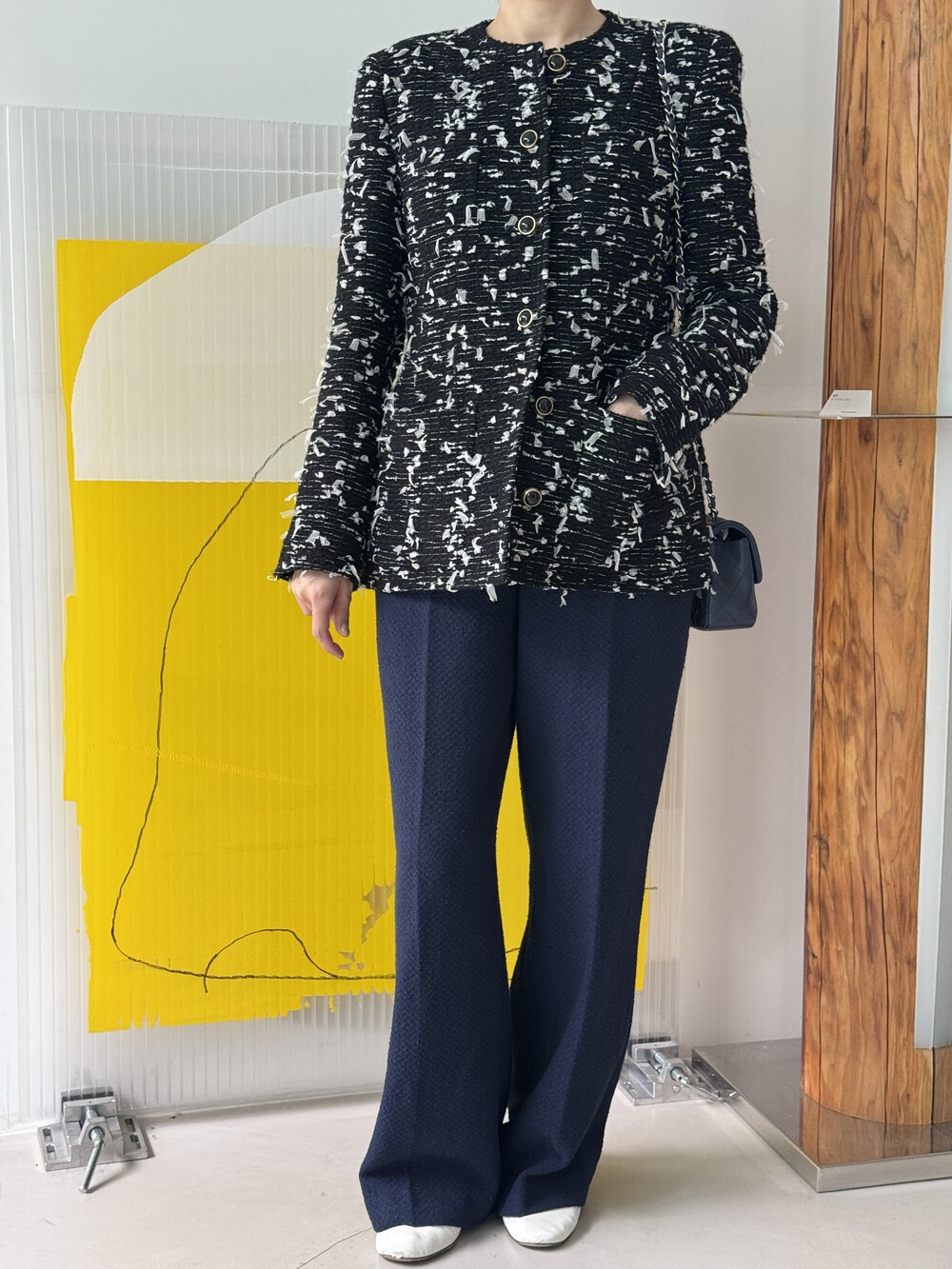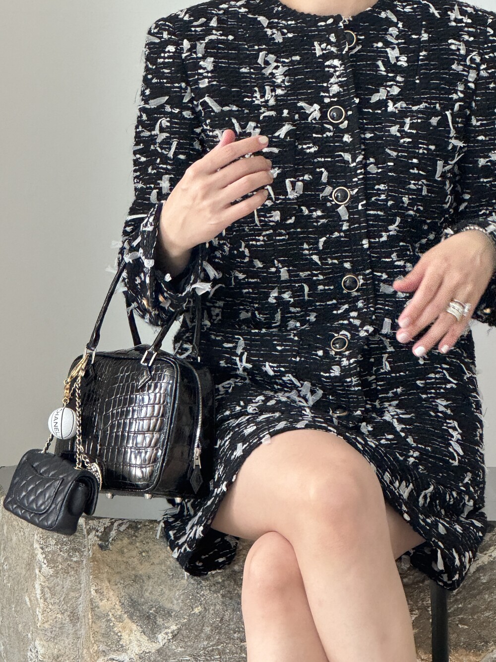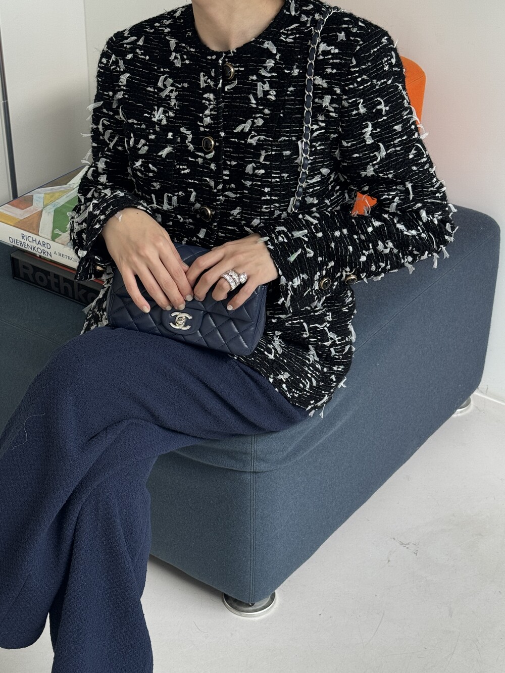 스커트는 동일한 고급 트위드 패브릭으로 제작되어 자켓과 셋업으로 착용할 수 있으며,