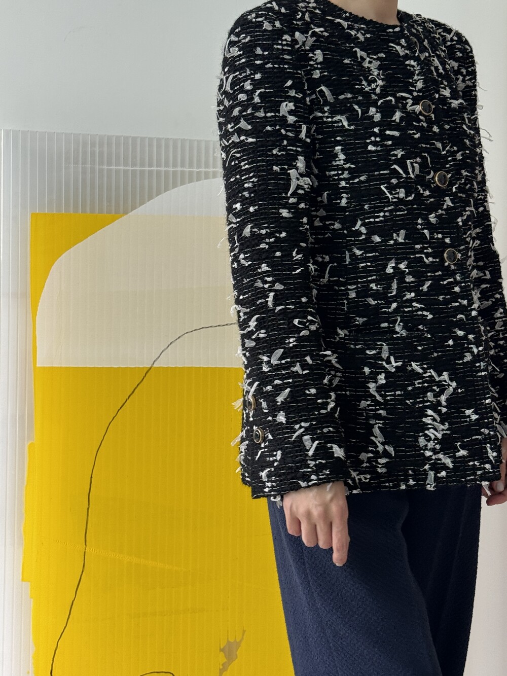 재킷은 어깨에서 소매로 이어지는 곡선을 위해 반래글런 패드를 사용해 자연스럽고 부드러운 라인을 살렸습니다.
