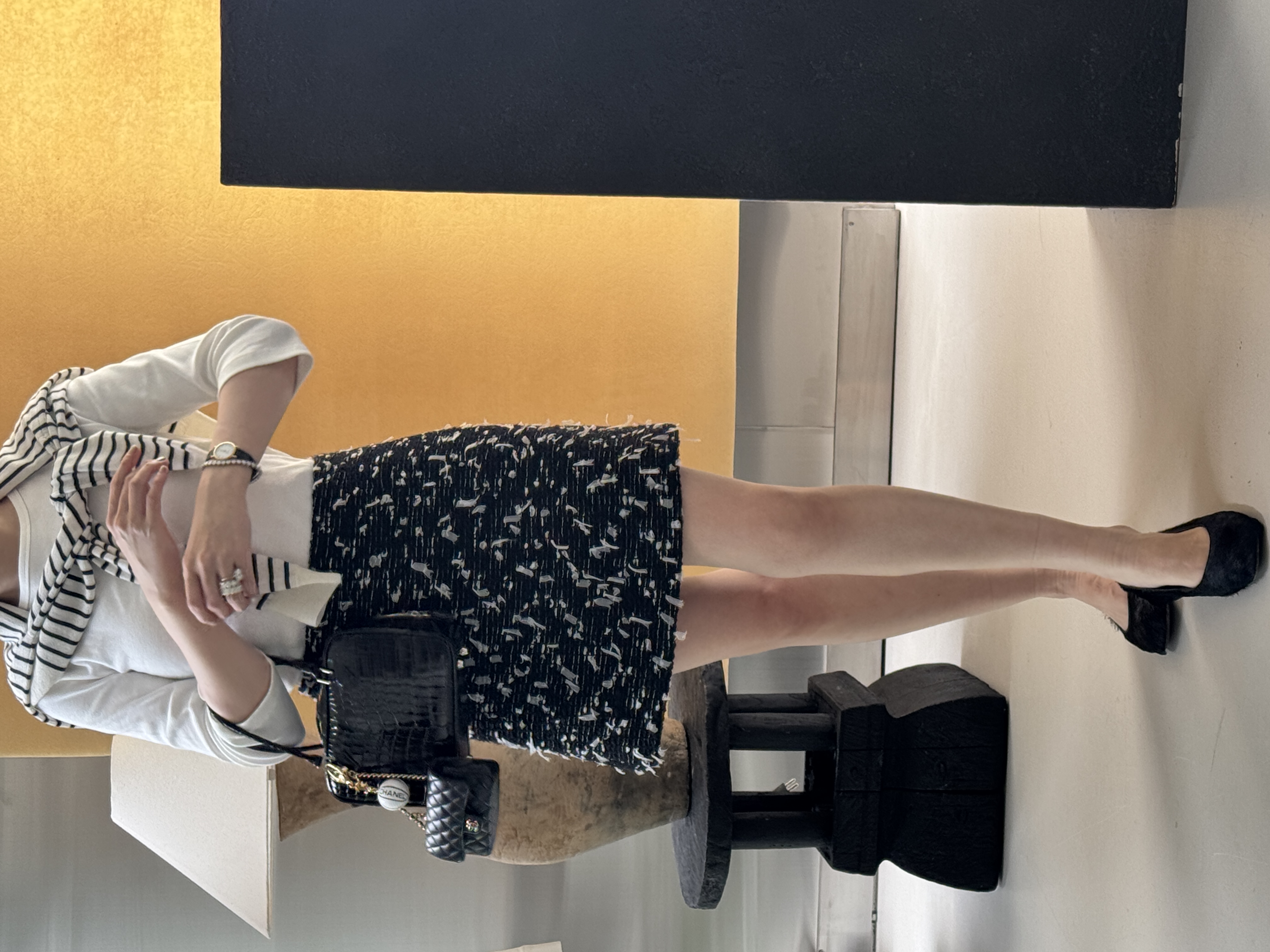 스커트는 동일한 고급 트위드 패브릭으로 제작되어 자켓과 셋업으로 착용할 수 있으며,