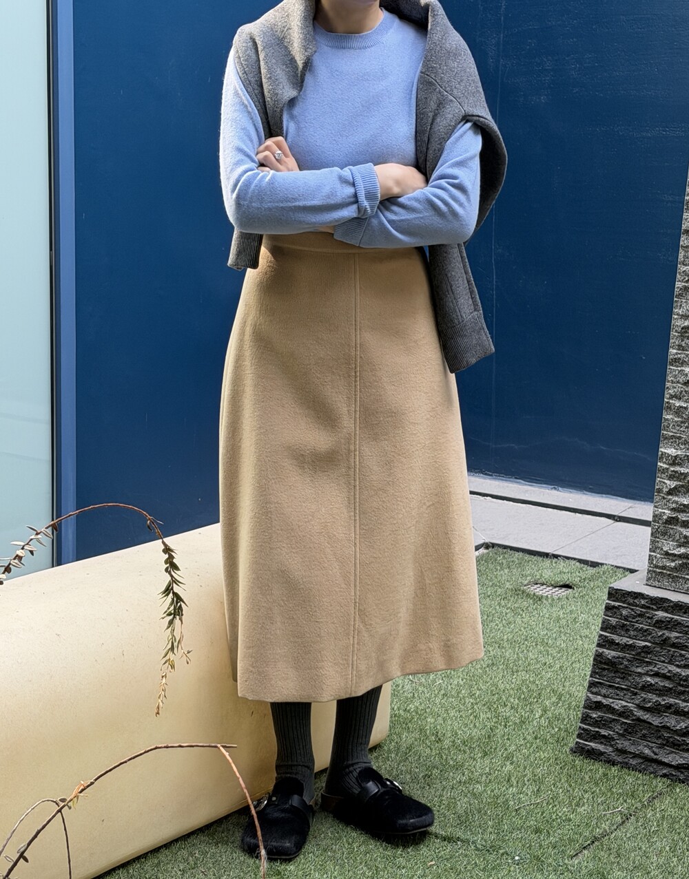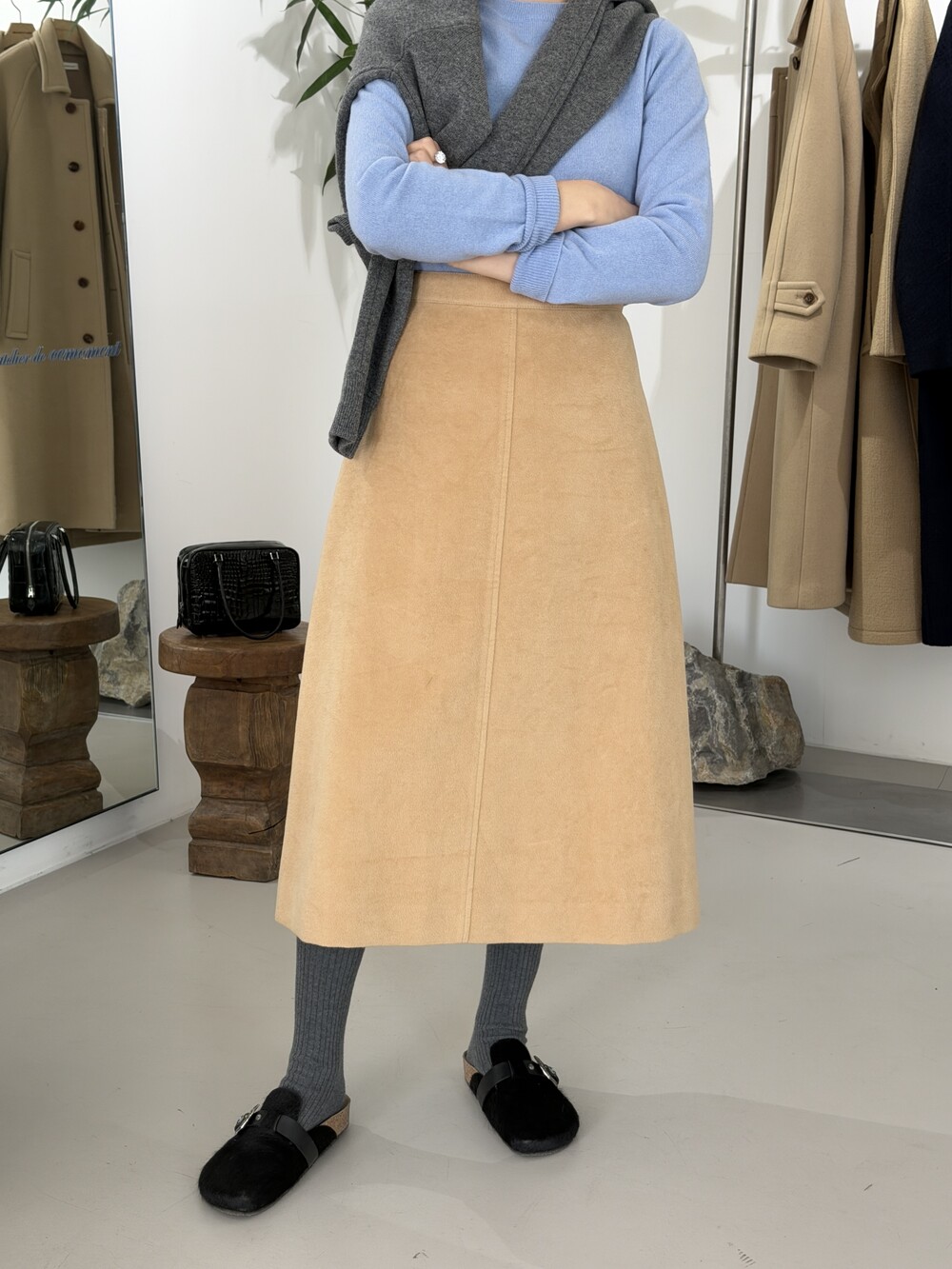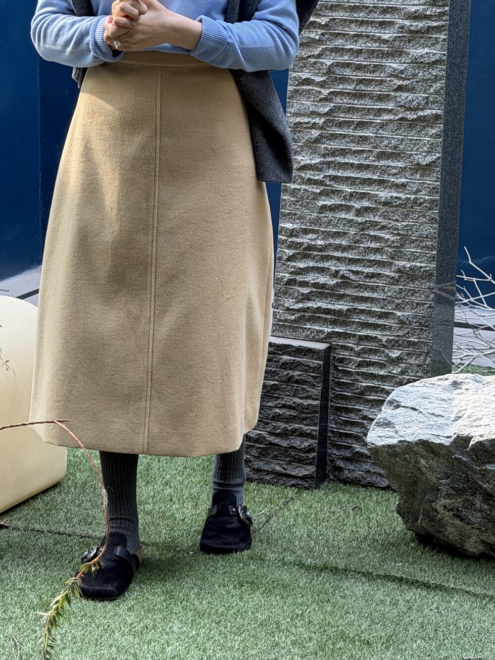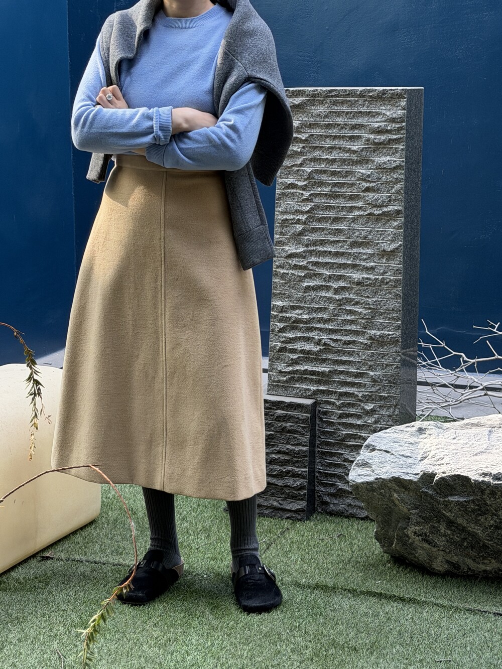 겉은 송치 느낌의, 울 성의 부드럽고 따뜻한 질감과 적당한 두께감을 조합한 스커트입니다.