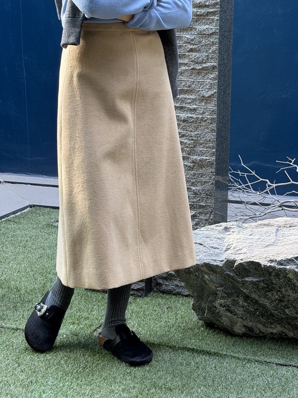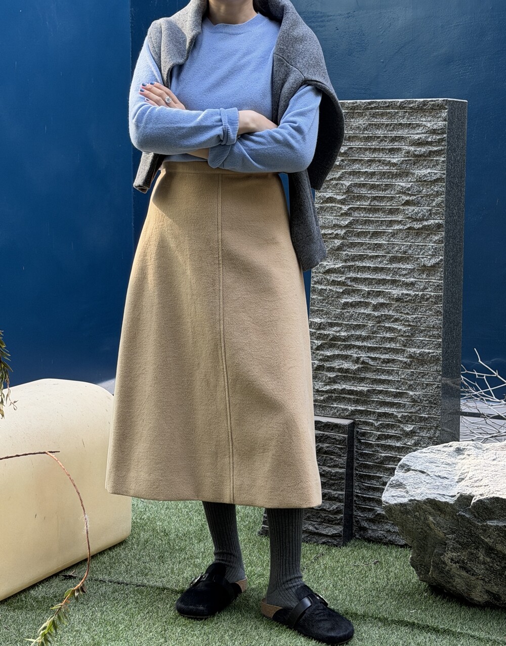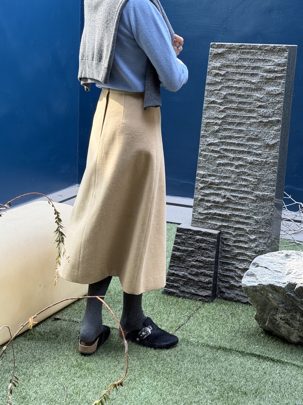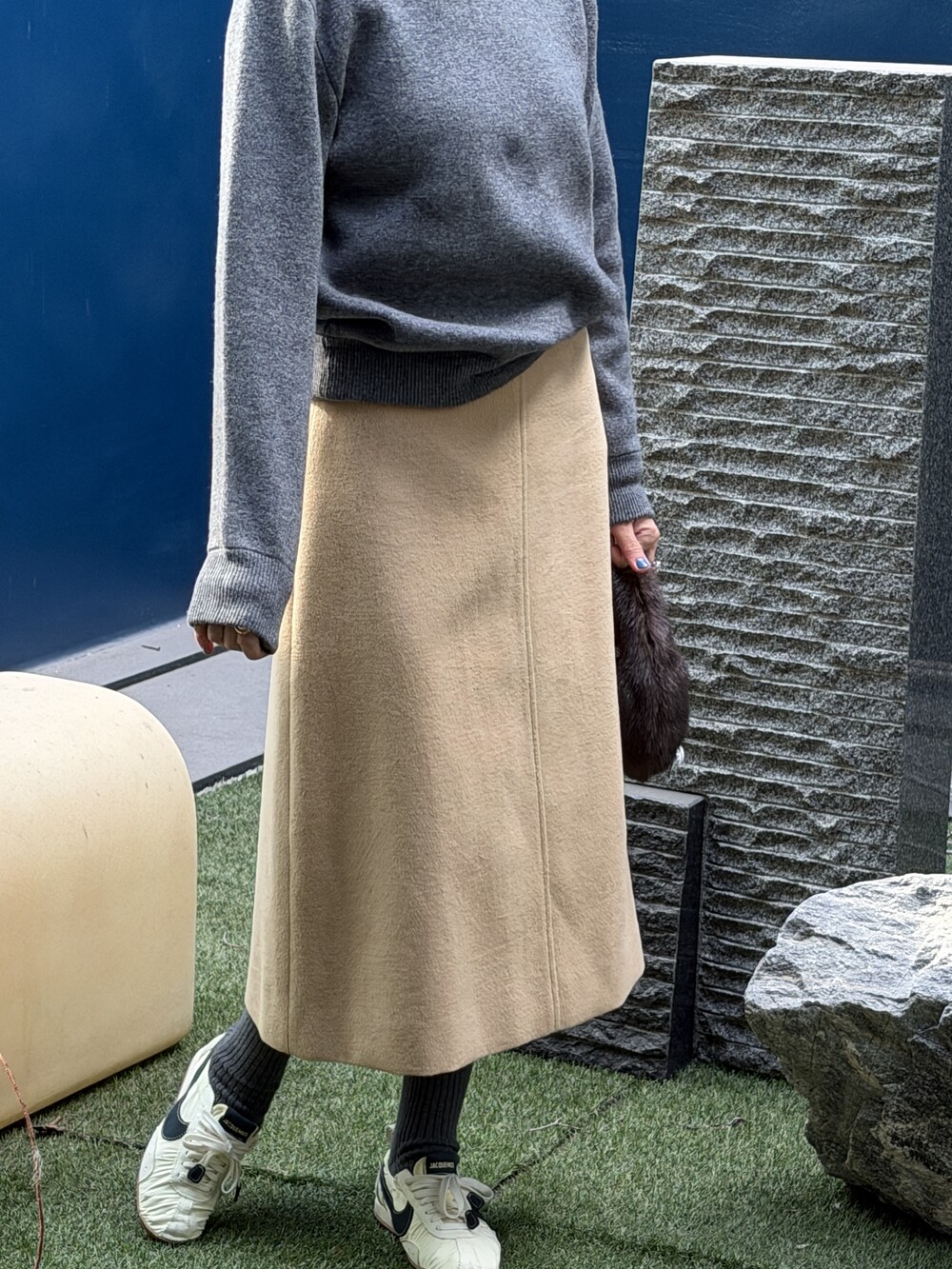 겉은 송치 느낌의, 울 성의 부드럽고 따뜻한 질감과 적당한 두께감을 조합한 스커트입니다.