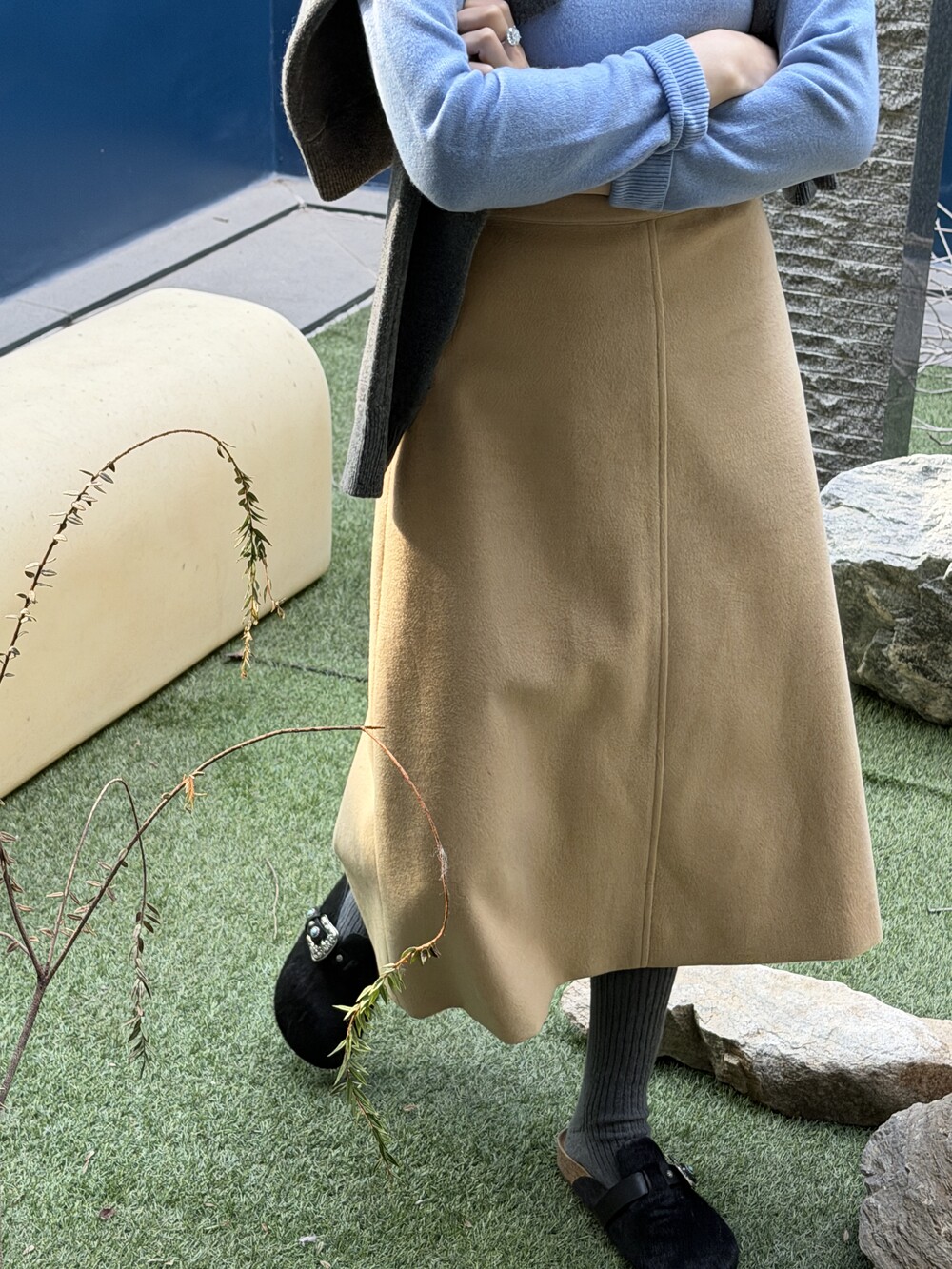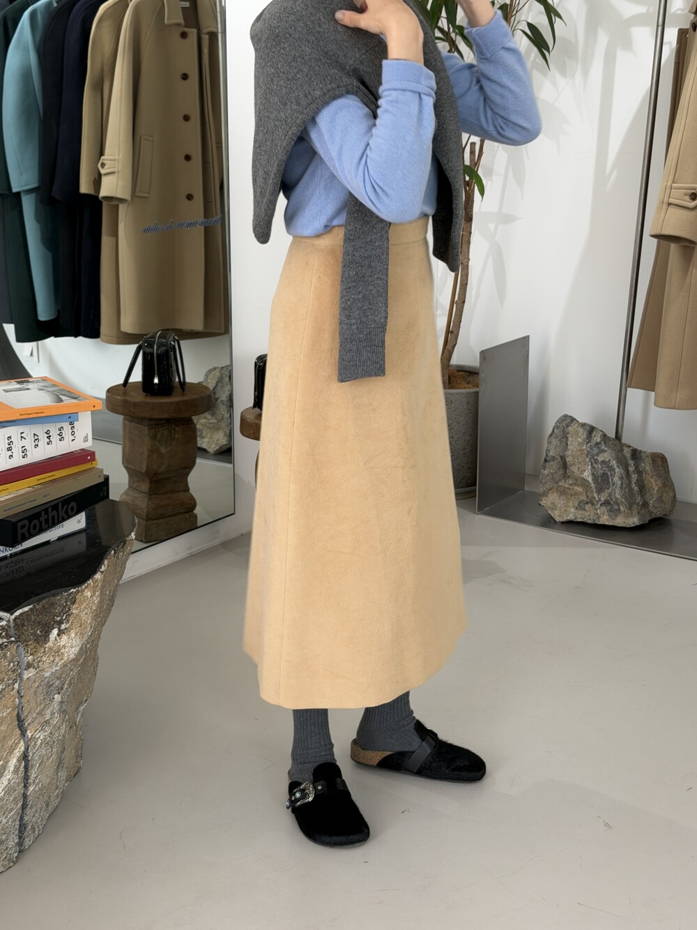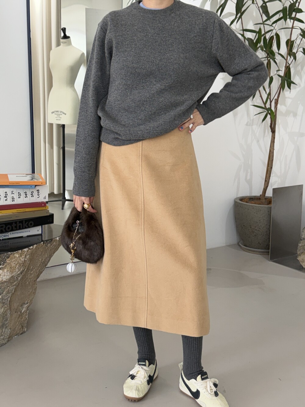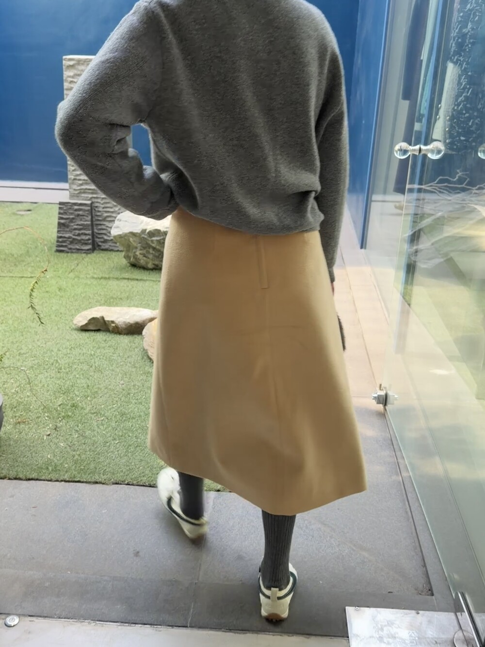 겉은 송치 느낌의, 울 성의 부드럽고 따뜻한 질감과 적당한 두께감을 조합한 스커트입니다.