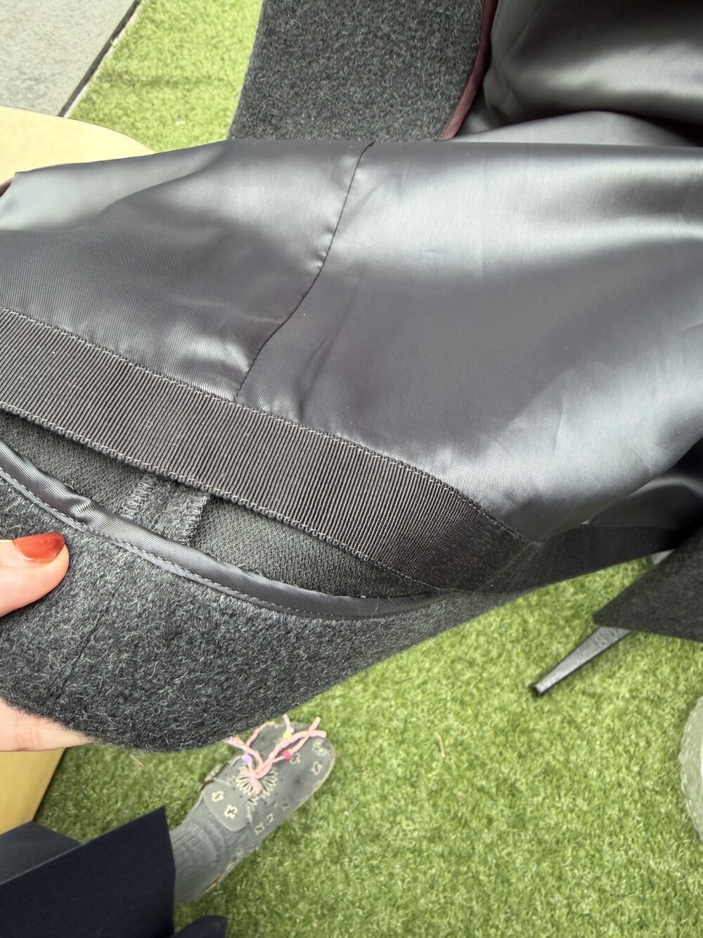 원단의 밑단은 정교하게 해리 작업을 하였고 안감은 따로 밑단에 골 테이프를 덧대는