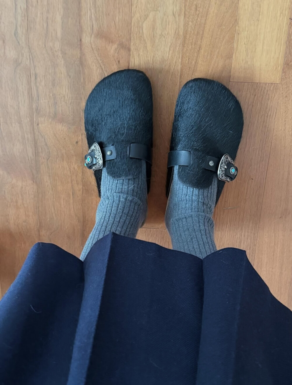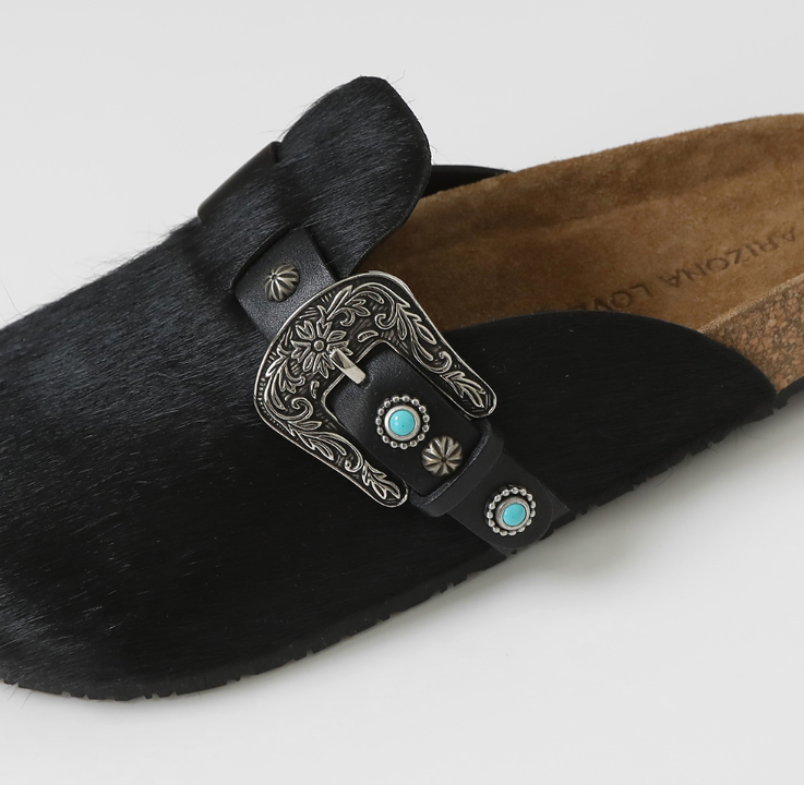 : 천연 소가죽 여성용 클로그로 윗부분에 메탈 버클 디테일 을 더하 견고하며 고급스러운 디자인