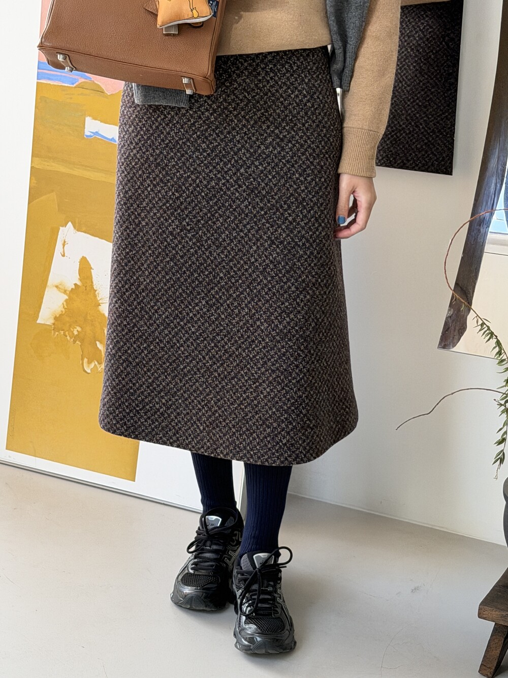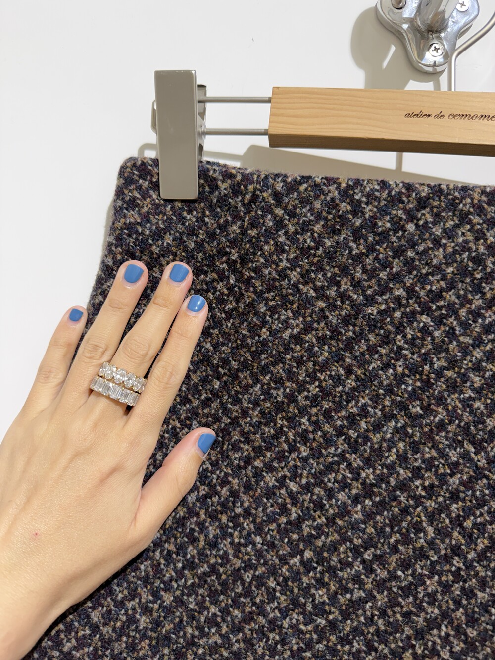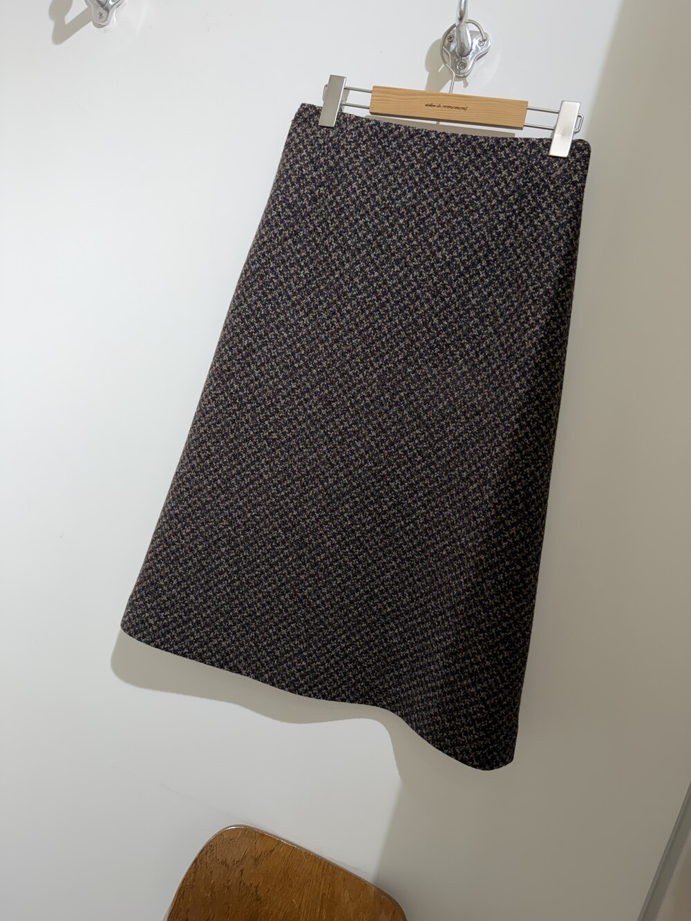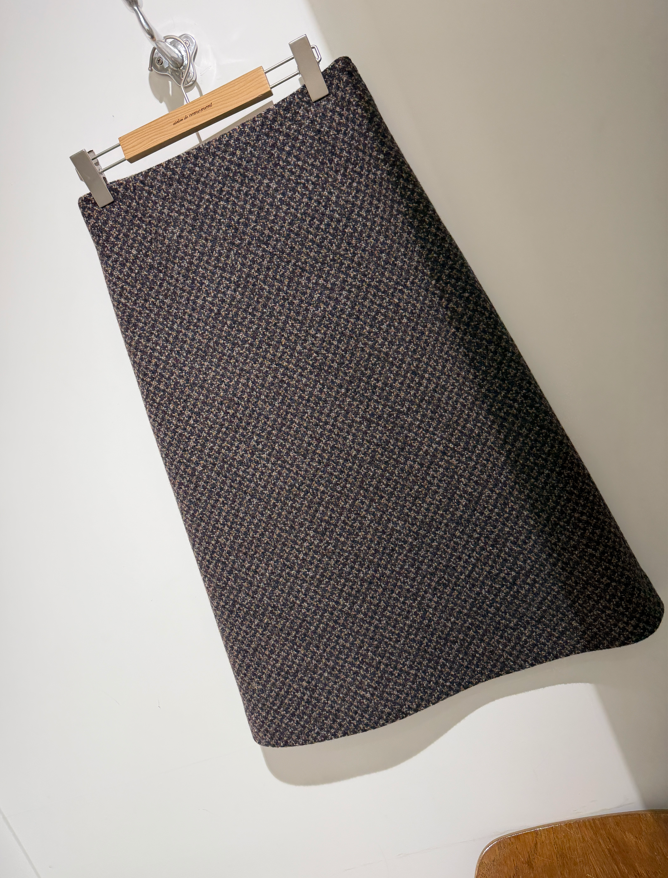 최소한의 절개선을 사용하고 바이어스로 재단하여 실루엣을 살린 간결한 라인의세미 A 라인 스커트로
