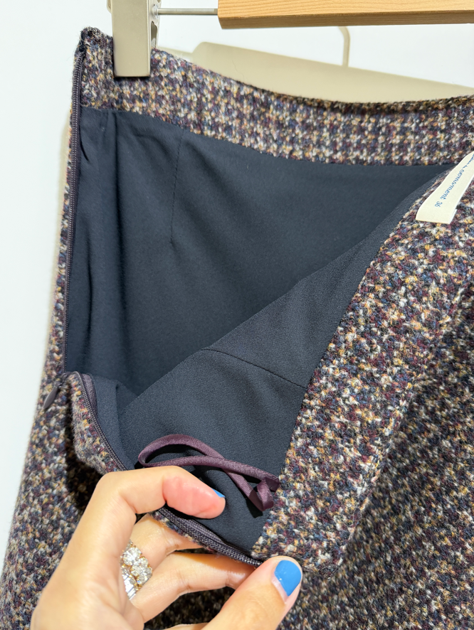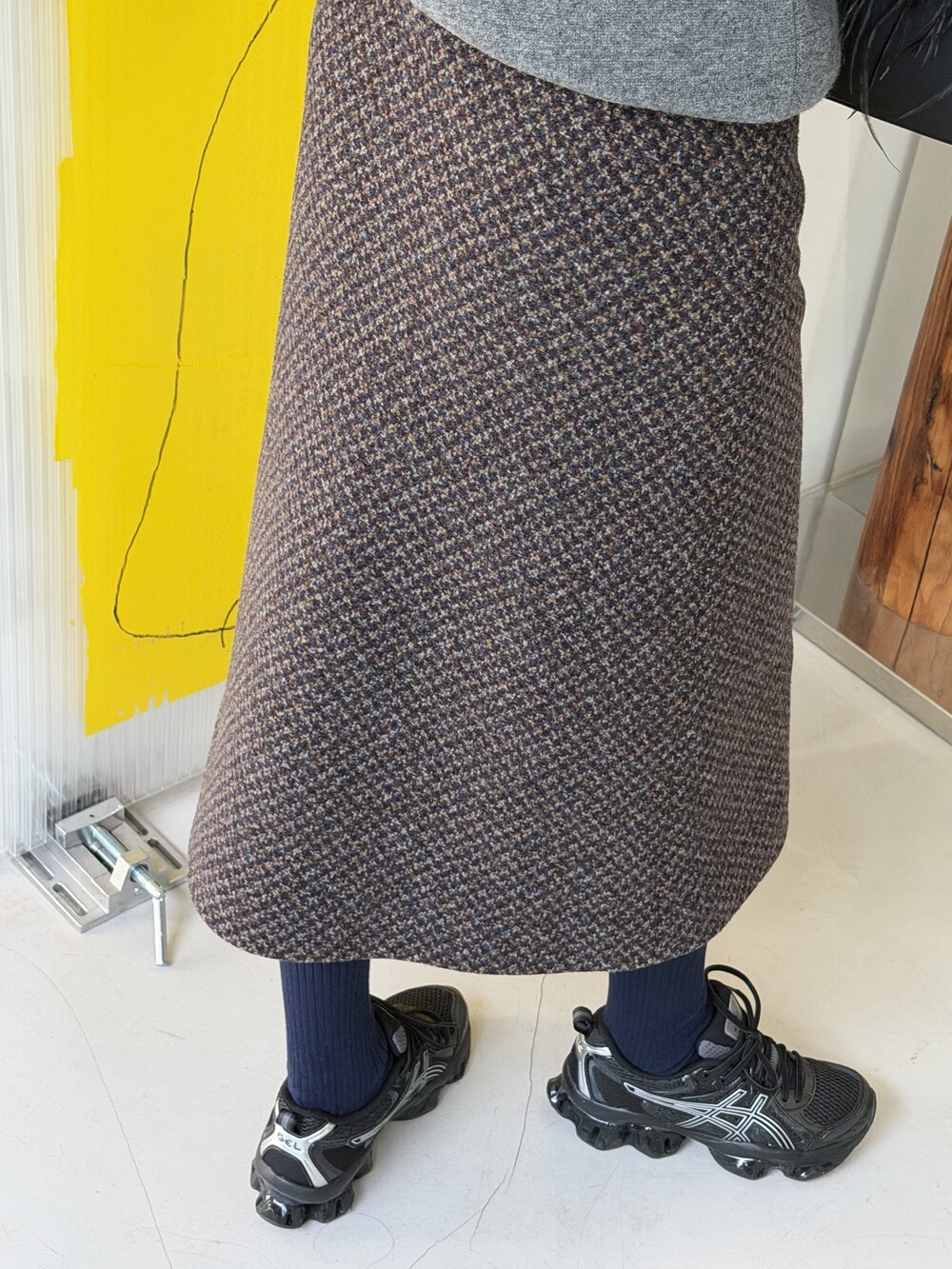 깊이 있는 퍼플 컬러 톤에 와인, 네이비, 베이지가 섞인 체크 원단으로 완성된 Daisy skirt 는