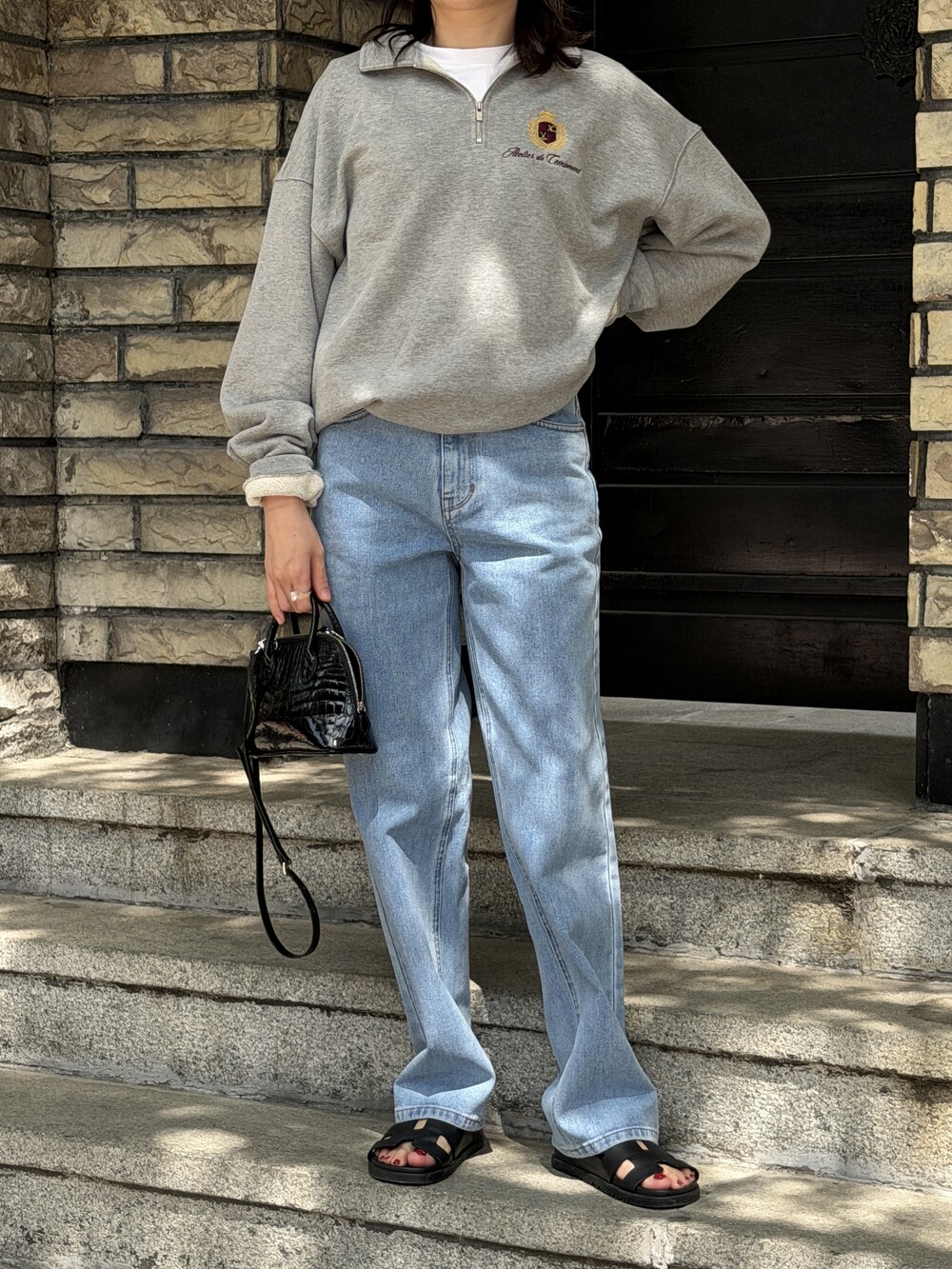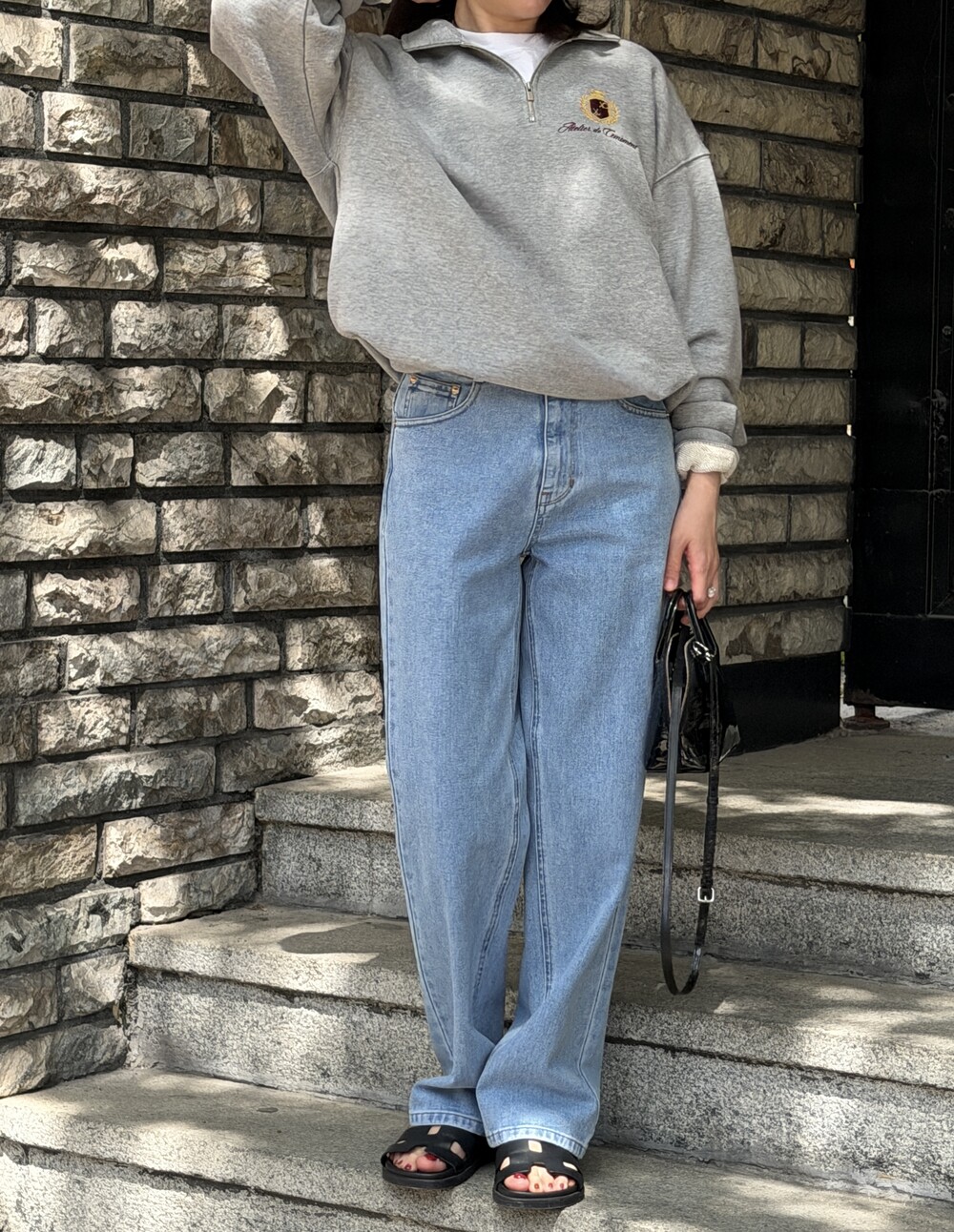 지퍼를 열어 카라처럼 연출하거나 모두 잠가 스탠드넥 스타일로도 착용할 수 있습니다.